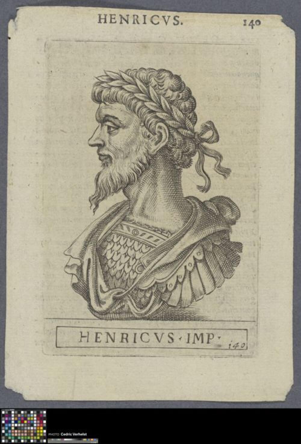 16de eeuwLodewijk de Vrome (Chasseneuil bij Poitiers 11 april 778 – Ingelheim am Rhein, 20 juni 840), ook wel de Eerlijke en de Joviale, was de koning van Aquitanië vanaf 781. Hij werd vanaf 813 mede-keizer met zijn vader Karel de Grote. Als enige overlevende zoon van Karel de Grote en Hildegard werd hij na de dood van zijn vader in 814 de enige heerser over de Franken. Hij wordt halvelings afgebeeld en positioneert zich naar rechts. Hij draagt een lauwerkrans op het hoofd. Zowel boven als onder de voorstelling staat een opschrift dat de geportretteerde identificeert. Op de verso van de prent is een doorlopende tekst leesbaar, deze identificeert de keizer op de volgende pagina in de publicatie. De prent is een illustratie uit Tomasz Treters "Romanorum Imperatorum Effigies" (Rome, 1583). De publicatie bestaat uit 157 gegraveerde portretten van Romeinse keizers door Giovanni Battista de' Cavalieri. Maakt deel uit van het album met (losse) portretten uit de 16de en 17de eeuw (2014.GRO0019.III).