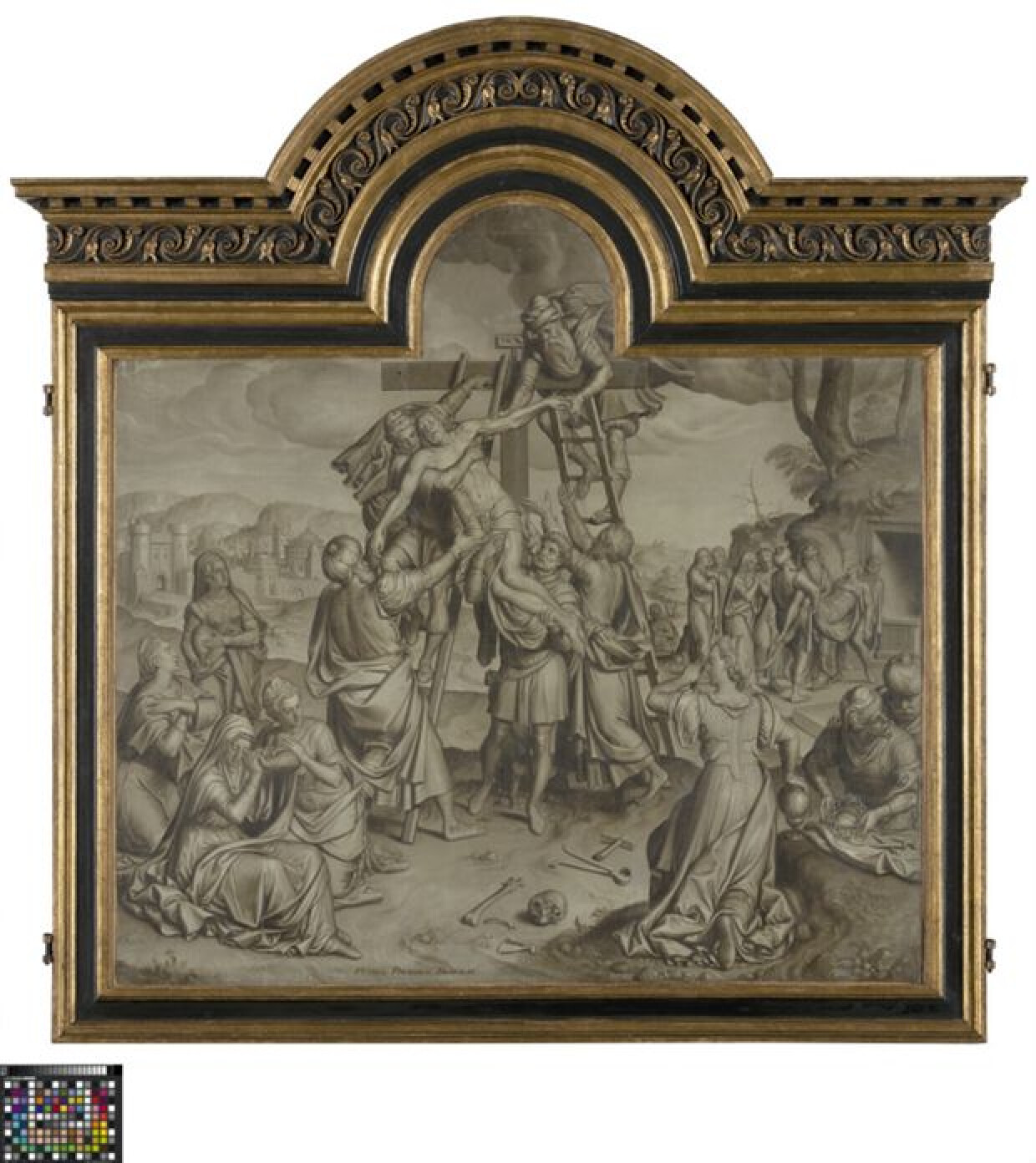 Dit middenluik maakt deel uit van een retabel (drieluik en predella) en bevat zes taferelen uit het leven van Christus, met het accent op de Passie. Het linkerluik toont de Kruisdraging, het middenluik de Kruisafneming met op de achtergrond de Graflegging en het rechterluik de Verrijzenis. Op de predella zijn van links naar rechts de Boodschap, de Aanbidding der herders en de Besnijdenis afgebeeld. Dit werk was oorspronkelijk op een doek geschilderd, maar werd vermoedelijk op het einde van de 16de eeuw of begin van de 17de eeuw omgevormd tot een sluitbaar drieluik, waarbij de verschillende panelen aan de voorzijde beplakt werden met de versneden fragmenten van het doek. Het werk is zowel naar samenstelling als door de grisailletechniek uitzonderlijk in het oeuvre van Pieter Pourbus. Gesloten vertoont het retabel in het bovenregister links Veronica en rechts, als opdrachtgever, een geestelijke, gepatroneerd door Karel de Grote; in het benedenregister links de H. Nicolaas, rechts de H. Adrianus, en op beide panelen een verschillend wapenschild, dat nog niet werd geïdentificeerd. Deze buitenzijde is niet in grisaille geschilderd en, naar de stijl te oordelen, op het einde van de 16de eeuw of begin van de 17de eeuw ontstaan.