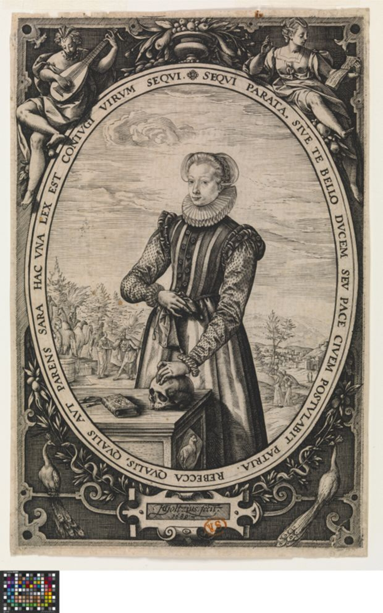 16de eeuwPrent gegraveerd door Hendrick Goltzius in 1589, tweede staat (H VIII, p. 44, nr. 185, als 'Cornelia van de Capelle'). Portret van Josina Hamels in een ovaal, voorgesteld in drie kwart achter een tafel, met een boek en een schedel, waarop haar rechterhand ligt; in de achtergrond de oudtestamentische scène met Rebeca die Eliezer te drinken geeft aan de bron; rond de ovaal een letterband met de inscriptie: 'Rebecca qvalis, qvalis.... postvlavit patria'; bovenaan in de hoeken een luitspeler en een zanger; in de hoeken onderaan twee pauwen. De prent hoort samen met een andere prent, met de voorstelling van haar man, Jacques de la Faille (H VIII, p. 44, nr. 184). De voorbereidende tekening voor de prent, met zilverpunt op perkament bevindt zich in het Teylersmuseum, Haarlem.