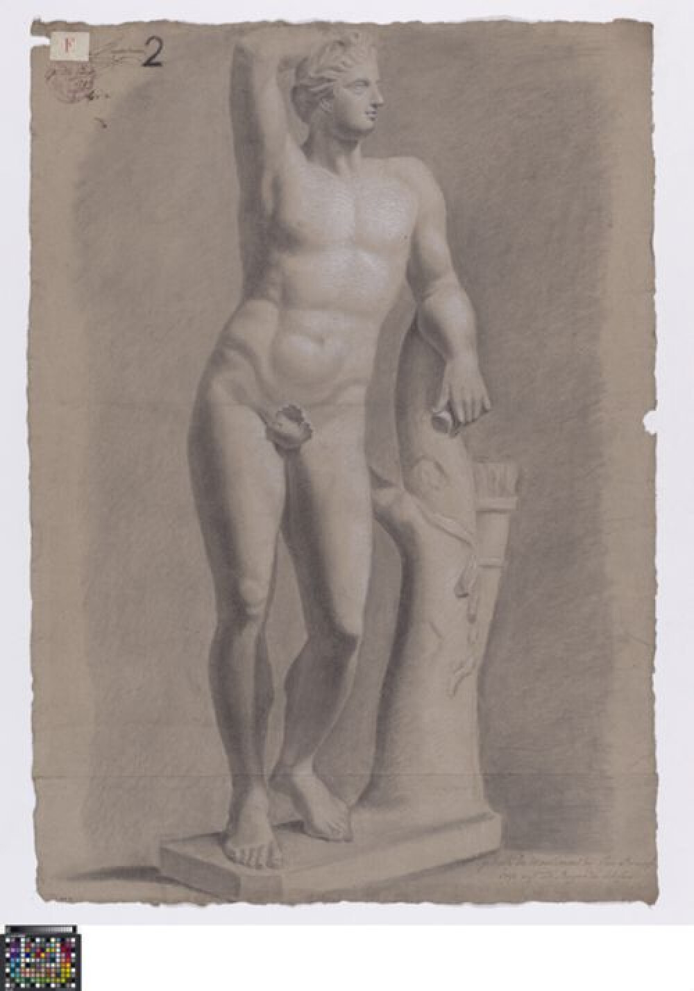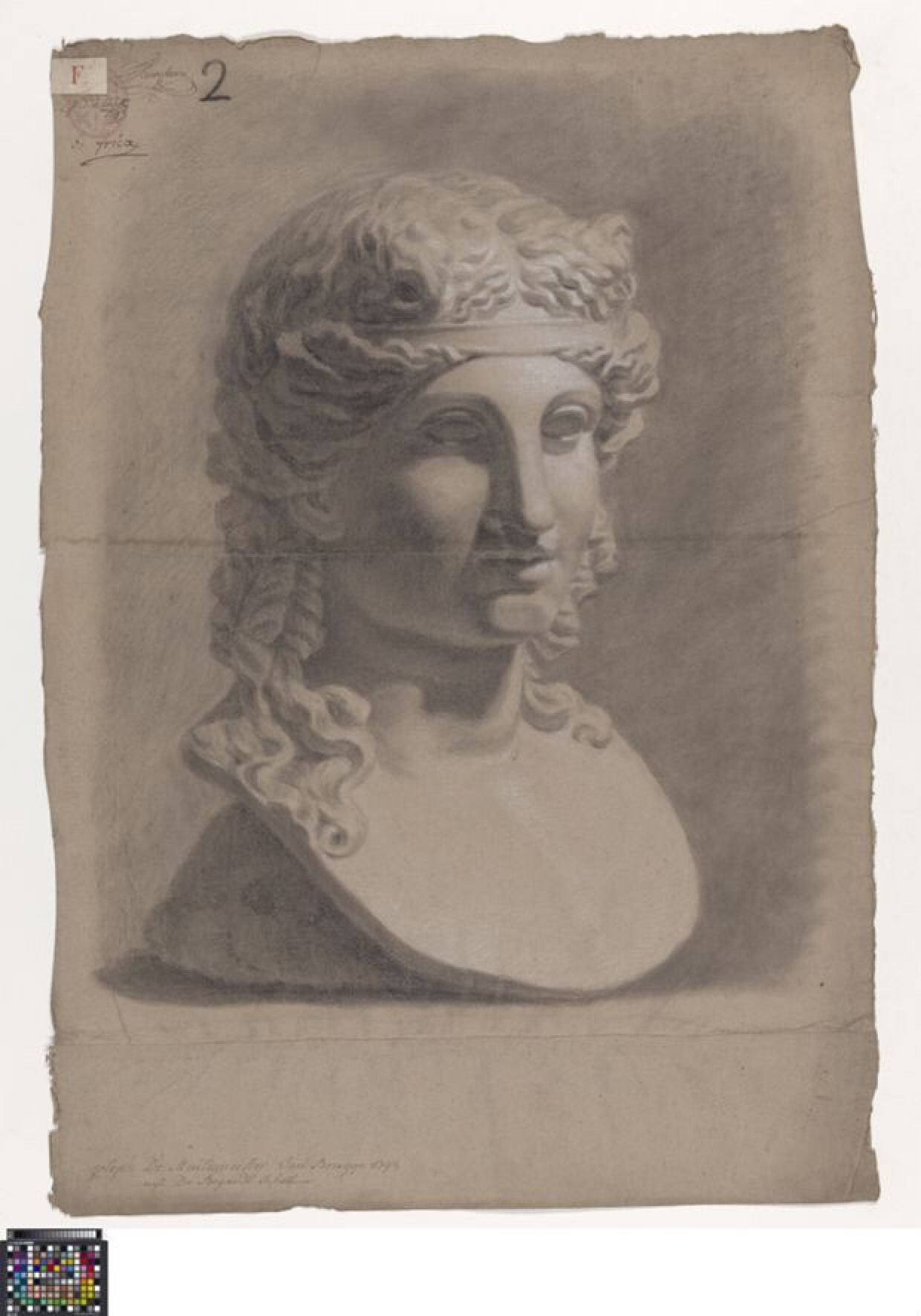 18de eeuwAcademische studie naar sculptuur van een buste van Dionysus, getekend door Jozef De Meulemeester uit Brugge in 1793. Met de tekening werd hij tweede in de prijswedstrijd; Albert Gregorius won toen de eerste prijs (0016.GRO0009.II). Beide leerlingen waren ingeschreven in de klas 'naar het plaester' aan de Academie Brugge (SAB, Academie, nr. 19). Voor de wedstrijd tekenden ze naar een afgietsel van het hoofd van Dionysos. De buste van de jonge god wordt door De Meulemeester in driekwart aanzicht getekend, met haarband, lang krullend haar en neerwaartse blik. Het gebruikte tekenmedium is zwart krijt of houtskool, gehoogd met wit krijt. Onder de tekening staat vermeld dat De Meulemeester afkomstig was uit de 'Bogarde schole' van Brugge. Bovenaan links is een papieren etiket op de tekening verlijmd met de toegewezen wedstrijdletter van de leerling (F) voor anonieme jurering. Bovenaan links staat de academiestempel, met de handtekeningen van Paul de Cock (directeur), Frans Vande Steene (secretaris) en Bernard Fricx (leraar). Het cijfer 2 duidt op de gewonnen prijs: De Meulemeester werd tweede.