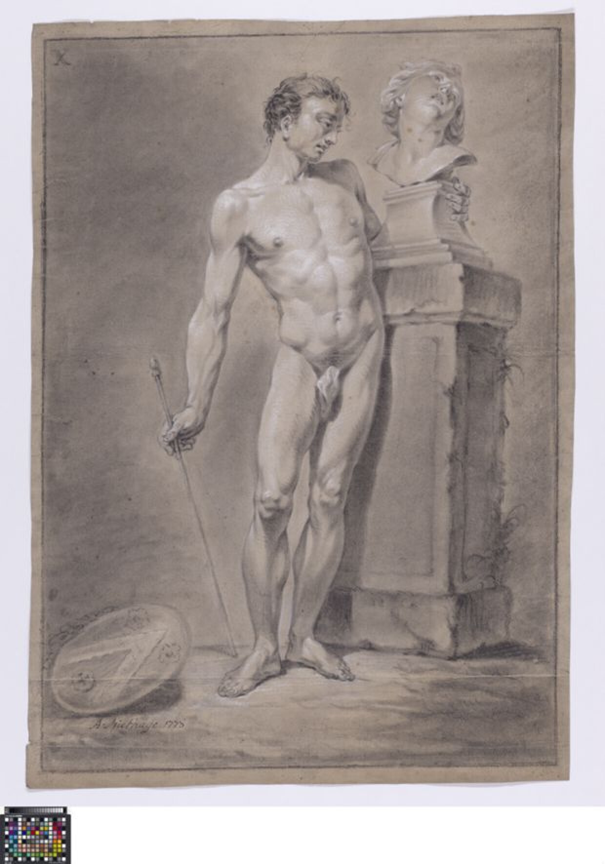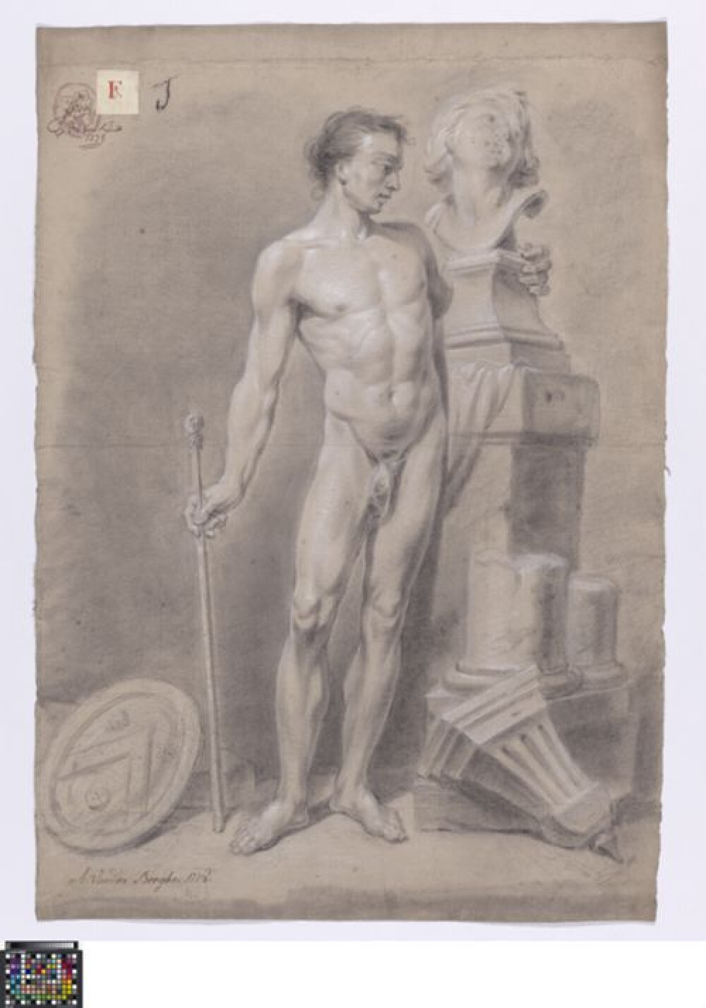 18de eeuwAcademische studie naar levend model van een staande naakte man met buste van Proserpina en wapenschild, getekend door Albertus Riethage in 1778. Riethage maakte deze studie als liefhebber tijdens het prijskamp van 1778 in de klas naar levend model. Het naakte model is frontaal in contrapost afgebeeld en houdt zijn linkerhand rond een buste van Proserpina, die op een hoge sokkel staat. Zijn gezicht is in profiel naar rechts getekend. Hij kijkt naar de sokkel. In zijn rechterhand houdt hij met gestrekte arm een schilderstok met een bolvormig uiteinde vast. Naast het model ligt het wapenschild van de familie De Crits, met een keper, twee vijfbladbloemen en een hostie (ring of kruis). De sokkel en buste zijn een kwartslag naar links gedraaid. De compositie is omkaderd met een enkele lijn, vermoedelijk in zwart krijt. Er is een aangelijmde strook onderin waarop de tenen van het model en een deel van het wapenschild getekend zijn. Hierop werd de naam van de tekenaar genoteerd, alsook het jaartal van de wedstrijd. De studie is getekend in zwart krijt of houtskool, met hoogsels in wit krijt. Er is geen academiestempel of handtekening aanwezig. De tekenletter die Riethage toegewezen kreeg 'X', is bovenaan links op het tekenpapier geschreven. De bladranden zijn afgesneden rondom het kader. Riethage tekende het model ook van op de rug gezien: 0016.GRO0058.II. Augustin van den Berghe won de eerste prijs in deze tekenwedstrijd (0016.GRO0053.II); Franciscus van Paemel werd tweede (0016.GRO0054.II). Ook Bernardus Fricx deed mee als liefhebber aan de wedstrijd (0014.GRO0092.II). Op de prijstekeningen zijn er architecturale rekwisieten afgebeeld die ontbreken op de tekeningen van de liefhebbers.