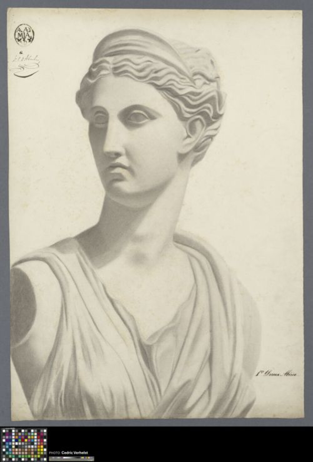 19de eeuwAcademische studie naar sculptuur van Diana, getekend door Edouard Goethals. Goethals was ingeschreven in de klas naar sculptuur in het schooljaar 1865-66 aan de Academie Brugge (SAB, Academie, nr. 9). Wellicht maakte hij deze studie voor de prijswedstrijd van dat schooljaar. Hij behaalde de tweede prijs. Klasgenoot Albéric Deroux werd toen eerste (0022.GRO0601.II) en Pharaon de Winter derde (022.GRO0599.II). Er werd getekend naar afgietsel van het beeldhouwwerk Diana van Versailles (Louvre, Parijs). De godin is afgebeeld met chiton en een diadeem in het golvend haar. De studie is getekend met zwart krijt of houtskool als medium. De leerling tekende de buste een kwartslag gedraaid, waarbij het gezicht van Diana frontaal weergegeven is. Linksboven staat de academiestempel met de handtekening van secretaris Vanden Abeele en de tekenletter voor anonieme jurering.