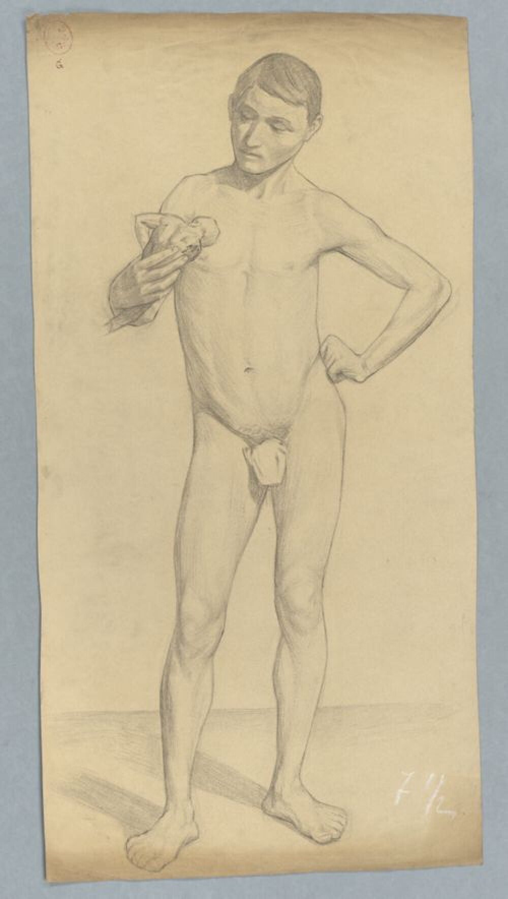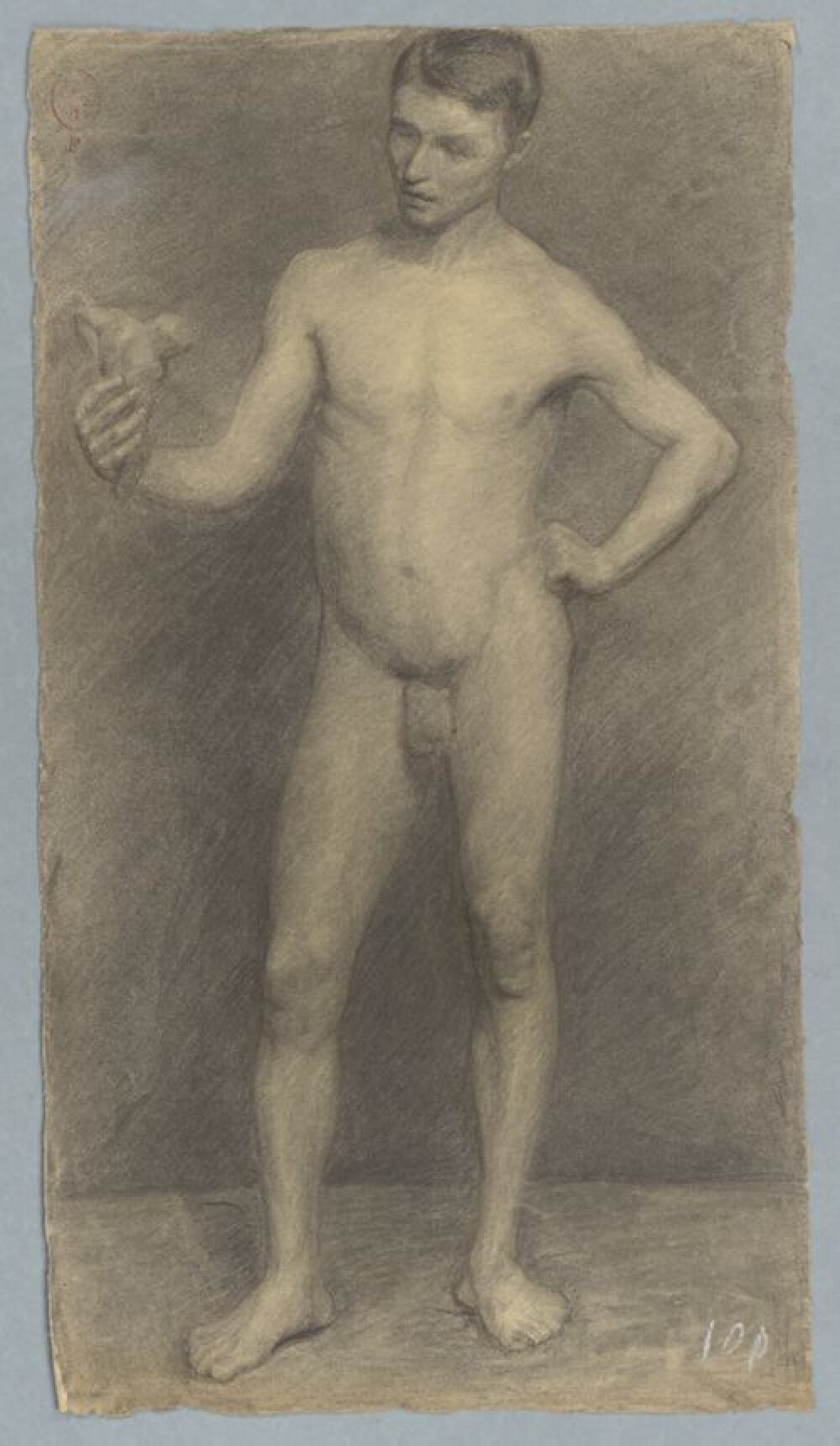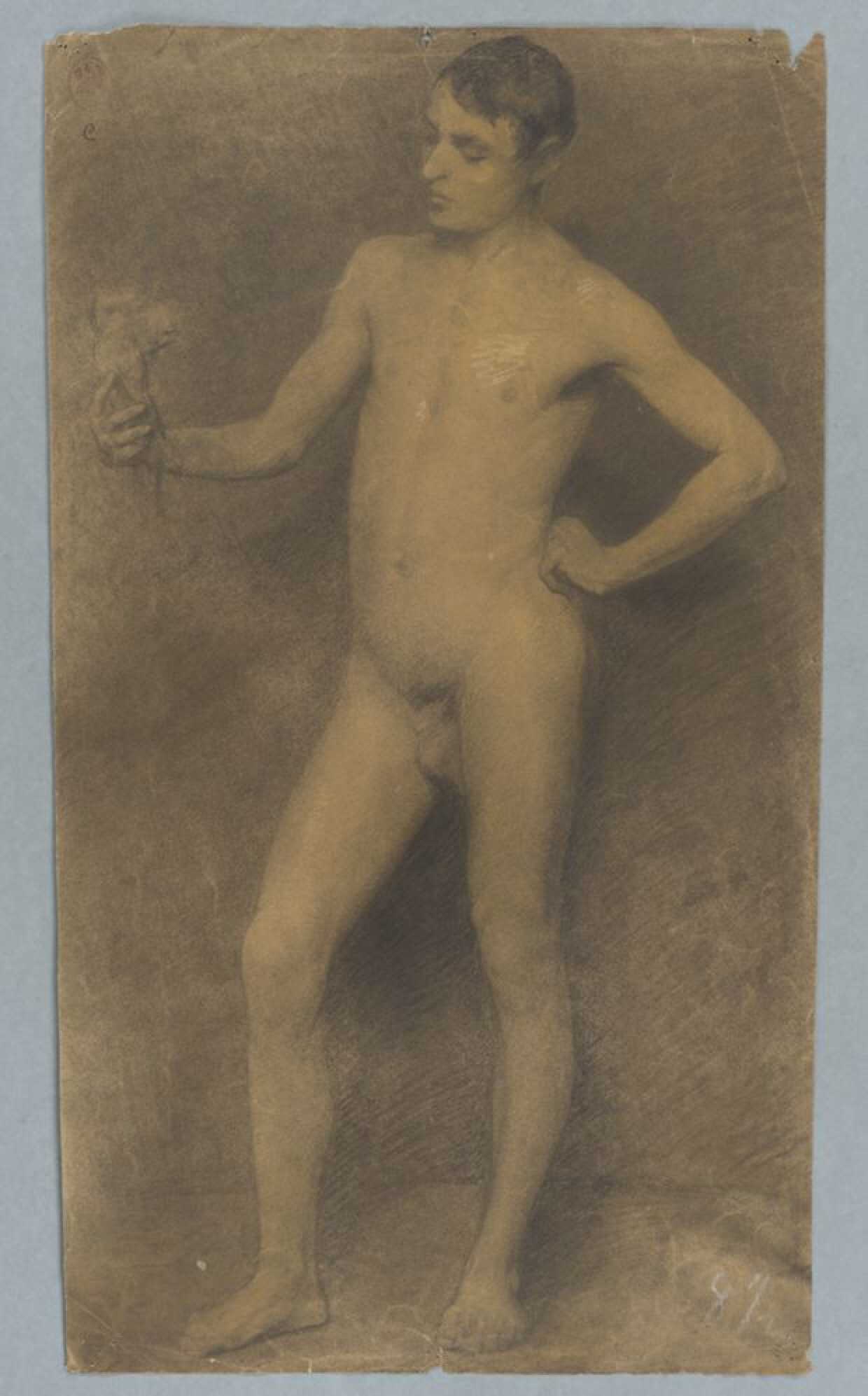 19de eeuw 20ste eeuwAcademische studie naar levend model, getekend door een onbekende kunstenaar in een onbekend jaar. Deze studie werd gemaakt in de klas 'Tekenen naar het leven' aan de Brugse academie. Het naaktmodel is een jongeman met kort haar die een popje of klein beeldje vasthoudt. De jongeman is ten voeten uit en in profiel weergegeven. Hij staat met het rechterbeen naar voren geplaatst in een contraposthouding en houdt zijn rechterhand in de lucht om naar het beeldje te kijken. Zijn linkerarm steunt op zijn heup. De tekening is vervaardigd in houtskool of zwart krijt, aangevuld met wit krijt. Er zijn meerdere tekeningen van deze wedstrijd bewaard gebleven, telkens met genoteerde punten rechtsonder. Deze tekening kreeg acht en een half punten. Het gaat hier niet om prijswinnende tekeningen, waardoor de naam van de vervaardiger niet bekend is.
