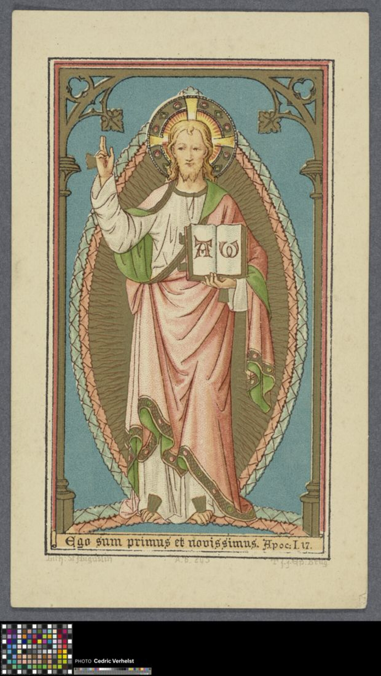 19de eeuw 20ste eeuwBidprent met Jezus, ten voeten uit binnen een architecturaal kader. In zijn rechterhand heeft hij een open boek met de Griekse letters α en ω, ofwel alfa en omega. Hiermee wordt verwezen naar een vers uit de Bijbel waar Jezus zegt dat hij voor gelovigen 'alfa en omega, de eerste en de laatste' is. Jezus draagt een wit gewaad, een rode mantel en een gouden aureool rond zijn hoofd. Hij heft zijn rechterhand op in een zegenend gebaar. Hij wordt omringd door een gouden stralenkrans met blauwe en rode rand.