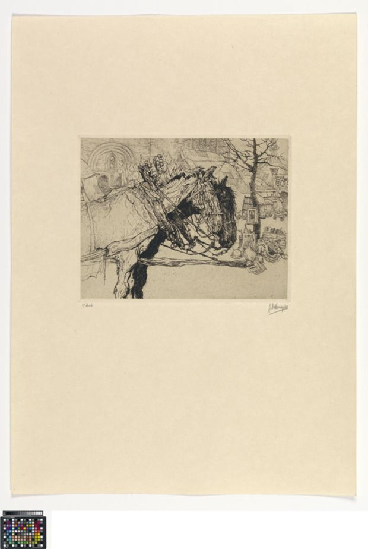 Twee ingespannen paarden zijn met kop en voorbenen in profiel naar rechts weergegeven. In de achtergrond een antiekmarkt voor een kerkportaal. Deze prent maakt als nummer 6 deel uit van het zevende, complete exemplaar van het album 'Sites et Vision de Gand' uit 1932.