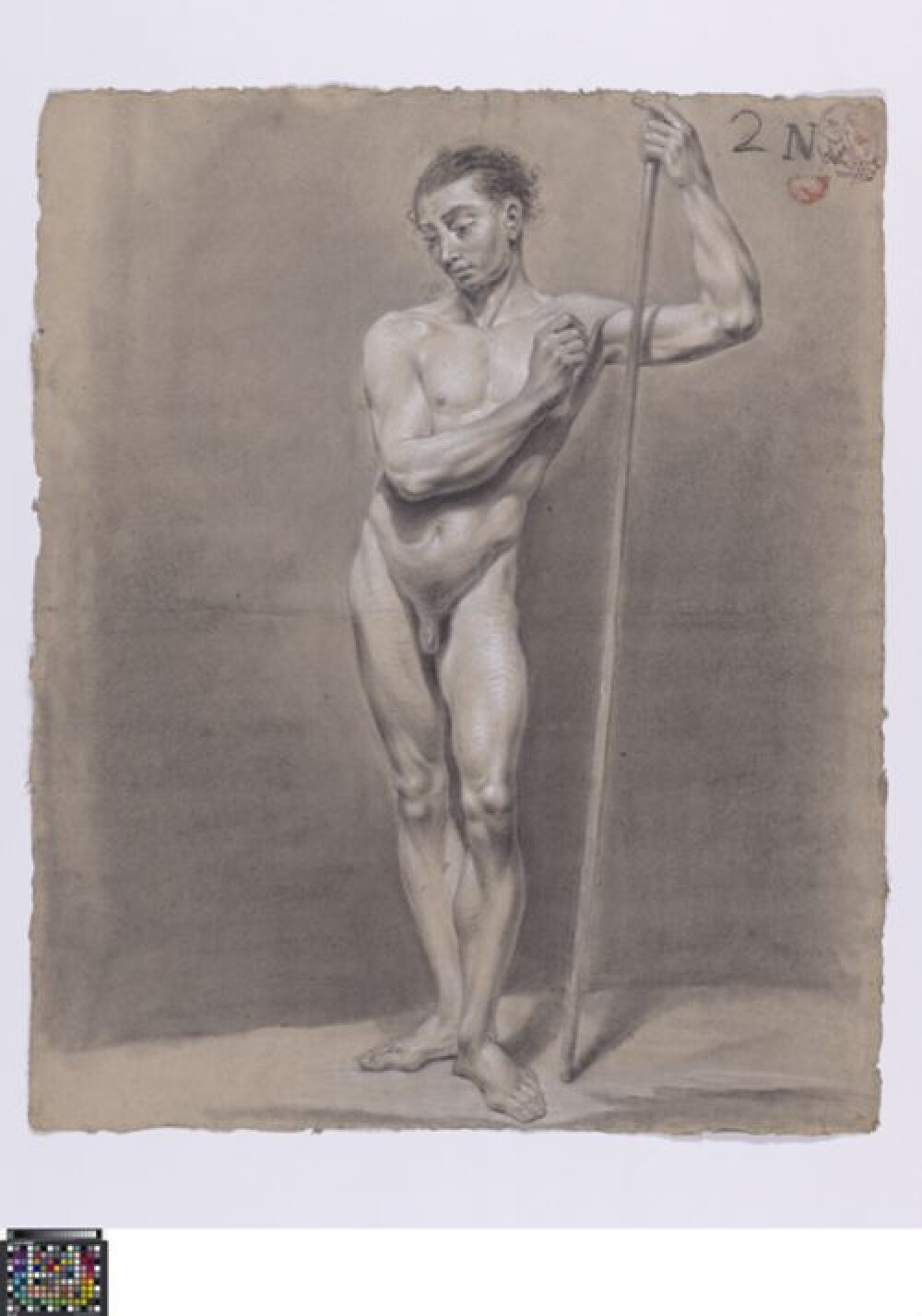 Academische studie naar levend model van een staand mannelijk naakt, getekend door een leerling aan de Academie van Brugge. De naam van de leerling is niet bekend, maar het gaat wellicht om een van de zes ingeschreven leerlingen in de klas naar levend model in 1778 (zie SAB, Academie, nr. 19). De anonieme leerling werd eerste in de ranking. Het gaat wellicht niet om een prijstekening maar een tekening om beste plaatsen. Dit is af te leiden uit de aard van de aantekeningen op het tekenpapier in vergelijking met de prijstekeningen uit hetzelfde jaar (zie bv. 0016.GRO0053.II en 54.II). Het model is frontaal afgebeeld, zijn torso een kwartslag naar links gedraaid. De naakte man steunt op zijn rechterbeen en stapt met zijn linkerbeen naar voor. Hij houdt zijn rechterarm geplooid voor zijn lichaam en laat zijn hand rusten op zijn borstkas. Zijn linkerarm is omhoog en gebogen. Hij steunt met zijn hand op een stok die tot op de grond reikt. De man kijkt naar linksonder. De tekening is uitgevoerd in zwart krijt of houtskool met hoogsels in wit krijt. Rechtsboven vinden we informatie over de wedstrijddeelname: de vermelding van de behaalde plaats in de ranking (1ste), de tekenletter van de leerling in wit en zwart krijt (H), de handtekening van de directeur Paul de Cock en de academiestempel. Het lijmrestant wijst er op dat de informatie deels afgedekt werd, wellicht voor anonieme jurering. Uit dezelfde wedstrijd is nog een studie bewaard, getekend door de (anonieme) leerling die toen tweede in ranking werd: 0016.GRO0059.II. De wedstrijd om prijzen in 1778 werd gewonnen door Augustin van den Berghe (0016.GRO0053.II). Het kan zijn dat deze studie ook van zijn hand is. Hetzelfde model poseerde tijdens beide wedstrijden.