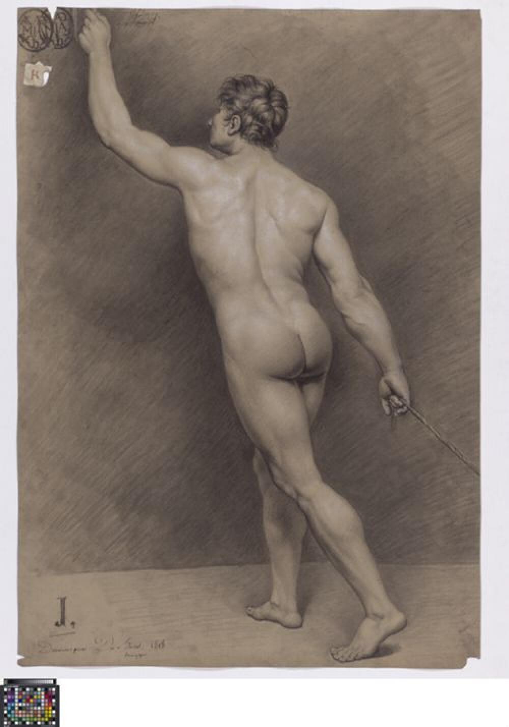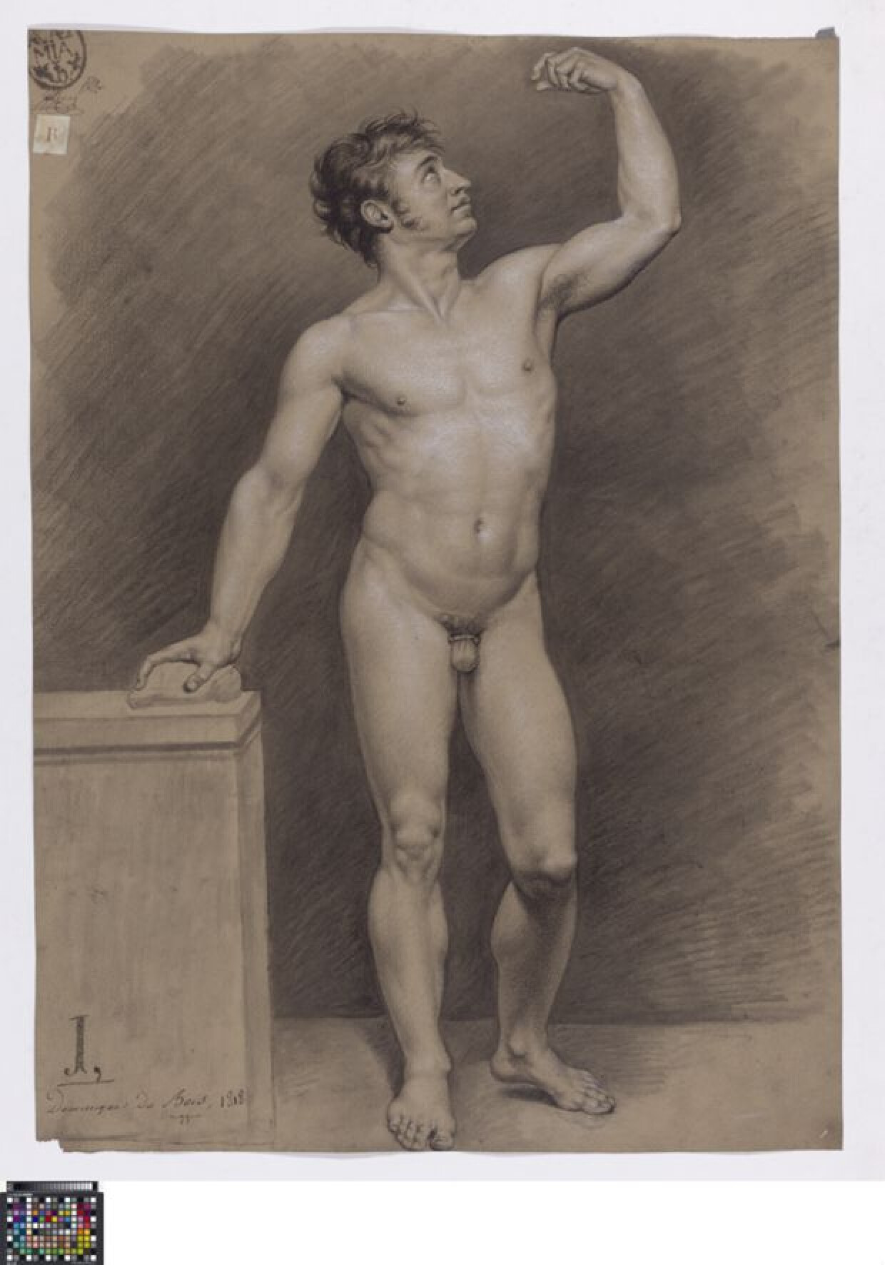19de eeuwAcademische studie naar levend model van een staande naakte man, getekend door Dominique Dubois in 1818. Dubois was toen leerling in de klas naar model aan de Academie Brugge. Voor de prijswedstrijd maakte hij twee studies (zie ook 0016.GRO0139.II) waarmee hij primus van zijn klas werd. François van Quaillie werd tweede (0022.GRO0369.II). Een naakte man is frontaal afgebeeld, zijn hoofd in profiel naar rechts. Hij staat in contrapost en leunt daarbij met zijn rechterhand op een sokkel. Hij houdt zijn linkerarm gebogen omhoog en kijkt naar zijn hand. De studie is getekend in zwart krijt of houtskool, met hoogsels in wit krijt. De bladranden zijn rondom bijgesneden en de verschillende aantekeningen duiden op Dubois' wedstrijddeelname. Linksboven is de academiestempel met handtekening van directeur Ducq te zien. Op het etiket staat de tekenletter 'R', aan Dubois toegewezen voor deze prijswedstrijd. Dat hij de eerste prijs won, werd met een 'J,' (of 1,) linksonder genoteerd. Nadien werden zijn naam, afkomst en het wedstrijdjaar ook opgeschreven.
