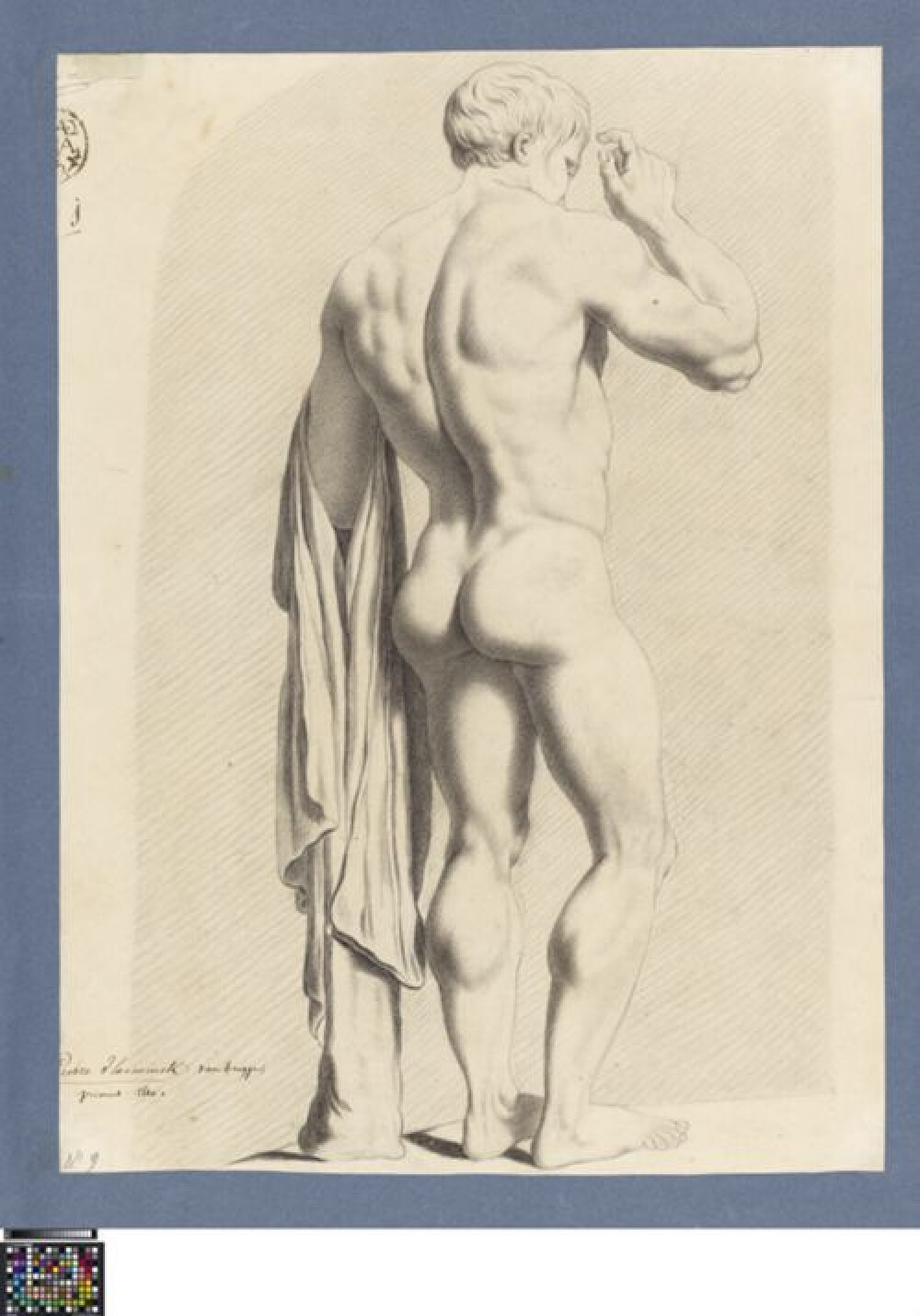 19de eeuwAcademische studie naar prent van een vrouw met een ster, getekend door Pieter-Jan de Vlamynck in 1810. De Vlamynck was toen leerling in de eerste klas naar prenten aan de Academie Brugge. Voor de prijskamp maakte hij twee studies (zie ook 0016.GRO0142.09.II), waarmee hij de eerste prijs behaalde. Het onderwerp van de studie is een vrouw, afgebeeld tot op de borst in profiel naar links. Haar gezicht is frontaal weergegeven. Over haar ontblote linkerschouder ligt een doek gedrapeerd. Ze draagt een haarband in haar samengebonden lokken. Boven haar hoofd is een ster getekend met stralen rondom. In het doek en haar haren wordt beweging gesuggereerd. Naar welke prent de Vlamynck tekende is niet geweten. Het gebruikte medium is zwart krijt of houtskool. De bladranden zijn afgesneden, waardoor de aantekeningen deels verloren zijn gegaan. Deze verwijzen naar de wedstrijddeelname van de Vlamynck. Linksboven is de academiestempel te zien, met daarnaast een handtekening bedekt met etiket. Wellicht is dit de handtekening van Jan Donaas Seghers, leraar van de klassen naar prenten. Op het etiket is het tekennummer '11' te zien, dat voor deze wedstrijd aan de Vlamynck werd toegewezen. Dat hij de eerste prijs behaalde, werd met een 'j' genoteerd. Nadien werden onderaan de naam en afkomst van de leerling en het wedstrijdjaar genoteerd. De tekening wordt bewaard in een album waarin andere wedstrijdtekeningen naar prent gekleefd zijn. In dit album is de Vlamyncks andere studie uit deze wedstrijd op de voorgaande bladzijde verlijmd.