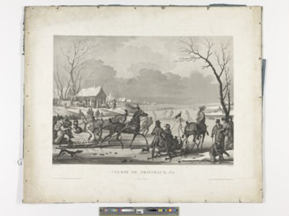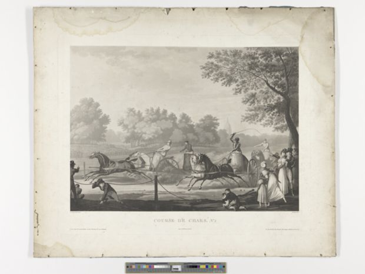 19de eeuwGezicht op een wedstrijd wagenrennen in een park. In de voorgrond juichen enkele toeschouwers vier paardenmenners toe. Deze prent werd gegraveerd door Antoine-Jean Gros naar een ontwerp van Carle Vernet. In Parijs trad Reslut op als prenthandelaar, M. Guerin fungeerde als uitgever.