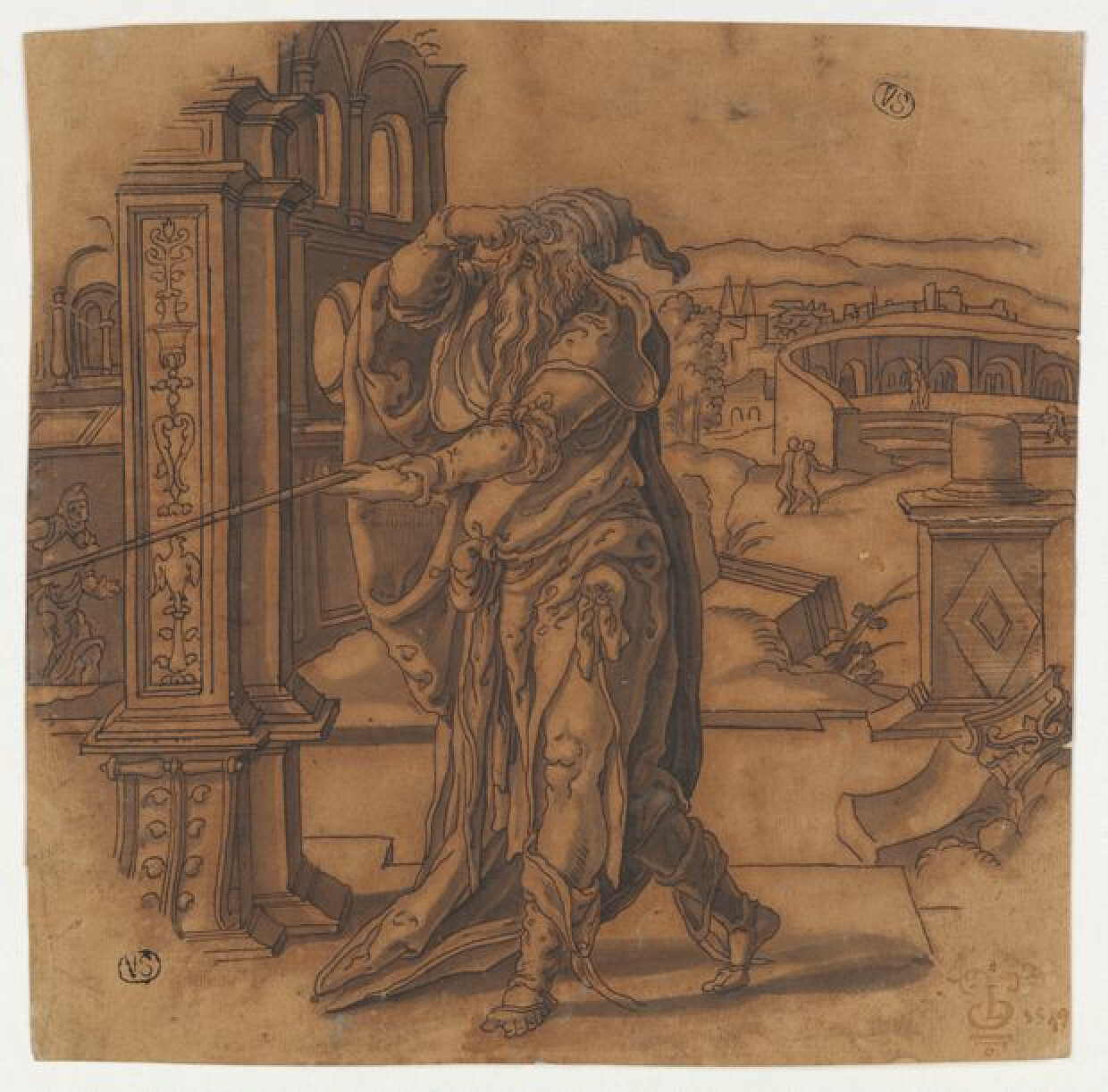 16de eeuwHoewel deze tekening in de rechter beneden hoek een monogram ‘LHC’ draagt en 1549 gedateerd is, blijft het onduidelijk wie de maker is. Omdat deze kunstenaar in de directe omgeving van Pieter Coecke van Aelst actief moet zijn geweest en er meerdere werken met hem in verband gebracht kunnen worden, is hem recent de noodnaam ‘Meester van de klevende draperieën’ gegeven. Deze tekening is wellicht overgetrokken van een ander ontwerp. Daarvoor werd de tekening met olie doordrenkt om het papier doorschijnend te maken. De ronde vorm van de compositie wijst erop dat het een ontwerp voor een klein gebrandschilderd ruitje was. Zo een ruitje maakte vaak deel uit van een serie, maar het onderwerp van deze reeks is onduidelijk. Ook de voorstelling van dit ruitje is niet geheel duidelijk. De blinde of slechtziende man die met een stok zijn weg zoekt, is misschien de blinde Tobias of de profeet Ahia.