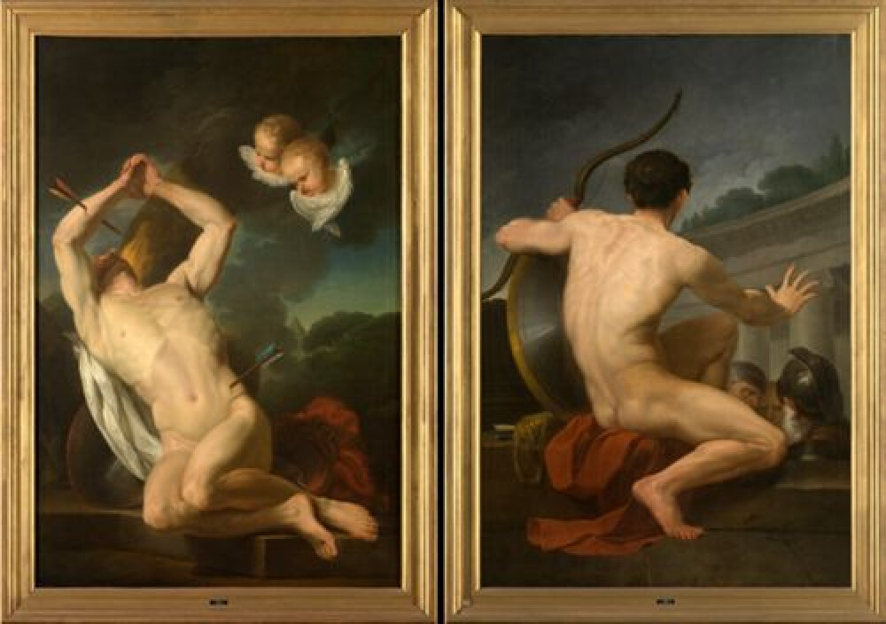 18de eeuwDeze Heilige Sebastiaan zou door Augustin van den Berghe gekopieerd zijn naar een werk dat zijn leermeester Joseph Benoît Suvée heeft geschilderd tijdens zijn verblijf te Rome. De Heilige Sebastiaan wordt door Suvée in 1777 van Rome naar Parijs gezonden en beoordeeld door de jury van de academie. Het jaar nadien stelt Suvée het doek nogmaals tentoon op het Parijse Salon, ditmaal samen met de Naakte krijger. Beide werken ontvangen gunstige kritiek:‘la finesse des tons, une touche spirituelle et exprimant la nature de chaque objet, et en général, tous les détails [...] bien soignés’. De heilige ligt op een verhoging met gekruiste handen boven het hoofd. De naakte mannenfiguur is een typisch voorbeeld van de oefeningen die aan de leerlingen van de ‘Académie de France’ in Rome worden opgelegd. Ze moeten immers naar een naakt poserend model een academische studie maken die als envoi naar Parijs gestuurd wordt ter jurering van de vordering in hun studie door de leden van de koninklijke academie. Lange tijd werd gedacht dat het hier om de originele werken van Suvée ging, totdat de kunsthistoricus Denis Coekelberghs het origineel van de Heilige Sebastiaan in een kasteel te Famenne ontdekte. Jammer genoeg is het door Denis Coekelberghs teruggevonden schilderij in Famenne ondertussen alweer verloren gegaan ten gevolge van een diefstal. Waarschijnlijk heeft Augustin Van den Berghe de werken gekopieerd tijdens zijn leertijd bij Suvée in Parijs.