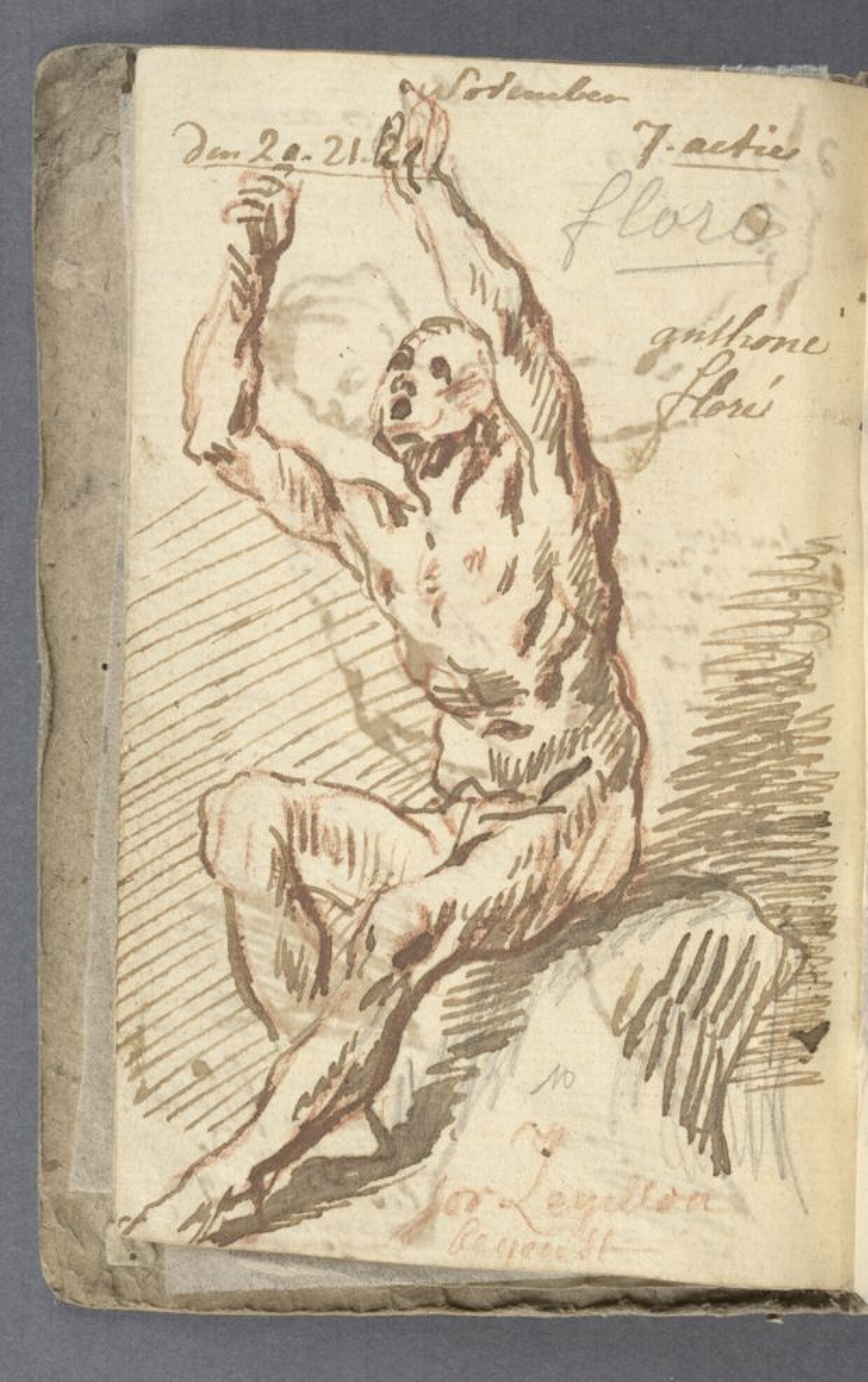 18de eeuwTiende bladzijde [blad 5, verso] uit een notitieboekje van Jan Garemijn als directeur van de Academie Brugge, daterend uit het schooljaar 1766-1767. Deze pagina bevat een geschaduwde schets van een zittend mannelijk naakt op een rots. Het model is frontaal weergegeven, zittend in driekwart naar links met beide armen in de lucht. Hij kijkt met een verbaasde uitdrukking omhoog naar zijn handen. Zijn linkerbeen is gestrekt, zijn rechterbeen geplooid. De tekening is geschetst in bruine inkt, met een ondertekening in rood krijt. In de rots zijn ook lijnen in grijs potlood te zien. Schaduwen zijn aangebracht door middel van arceringen. Het gaat om de zevende actie, geposeerd door het model Anthone Floré op 20, 21 en 22 november 1766. Onderaan in de notitie staat te lezen dat (jonkheer) Legillon aan de academie is begonnen.