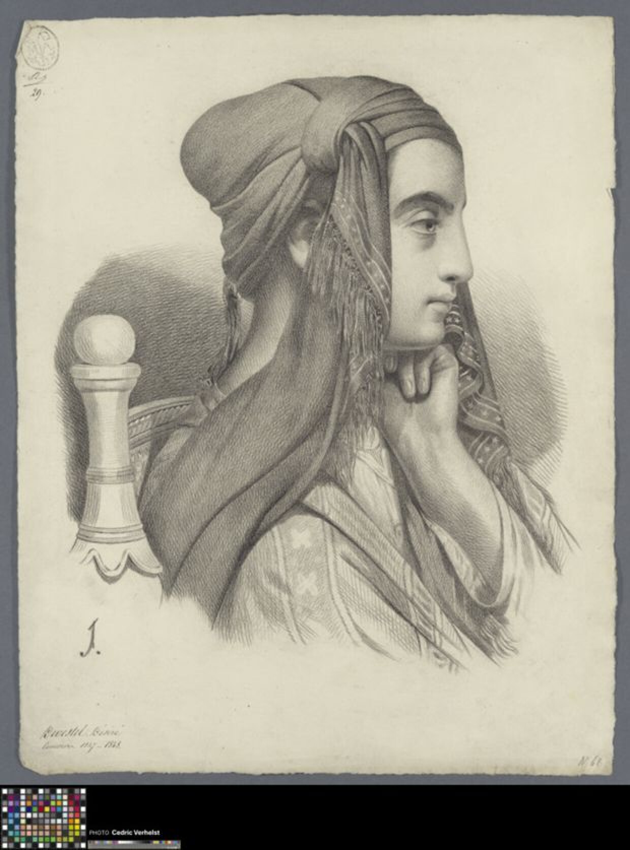 19de eeuwAcademische studie naar prent van een jonge vrouw, getekend door Désiré Devestel. Devestel was in het schooljaar 1847-1848 leerling aan de Brugse academie in de tweede klas naar prenten of "tête ombrée". Met deze studie werd hij dat jaar eerste bij de wedstrijd om plaatsen. Er werd getekend naar een prent waarop een jonge vrouw afgebeeld is tot aan de schouders. De vrouw is in profiel naar rechts weergegeven, gekleed in een los gewaad met geometrische motieven en ze draagt een geknoopte sjaal op het hoofd. Er is een deel van de rugleuning zichtbaar van de stoel waarop ze zit. Met een dromerige blik kijkt ze voor zich uit. Ze plaatst haar hand daarbij onder de kin. Het gebruikte medium is zwart krijt of houtskool. Devestel tekende deze studie onder het toegewezen nummer 29. Zo kon de jury bij deze wedstrijd onpartijdig oordelen. Onder de academiestempel staat de handtekening van secretaris Roels.