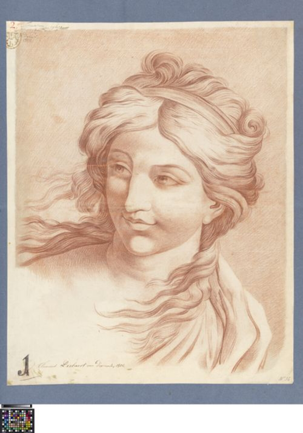 19de eeuwAcademische studie naar prent van een vrouw op een dolfijn, getekend door Thomas Joseph Liebaert in 1800 tijdens zijn studie aan de Academie Brugge. Liebaert, afkomstig uit Diksmuide, werd dat jaar primus van de eerste klas naar prenten. Hij tekende deze studie dus in het kader van de tweejaarlijkse wedstrijd om prijs. Een naakte vrouw is in rijdende pose op een visachtige weergegeven. Deze visachtige zou een dolfijn afbeelden. Het lichaam van de vrouw is in profiel weergegeven, net als de dolfijn waarop ze zit. Haar hoofd is in driekwart aanzicht getekend. Over haar linkerschouder ligt een doek gedrapeerd dat ze met haar rechterhand vasthoudt. Haar linkerarm is gestrekt en ze wijst voor zich uit. De lange staart van de dolfijn kronkelt omhoog achter de rug van de vrouw. De golven in het water suggereren een zwemmende beweging. Het gebruikte medium is rood krijt, met een ondertekening in zwart krijt of houtskool. Liebaerts aanpassingen zijn soms nog zichtbaar. Hij tekende deze studie naar een prent (gravure in crayonmanier) van Demarteau (graveur en uitgever), naar ontwerp van Le Barbier (tekenaar). Le Barbier tekende zijn ontwerp naar een origineel van Carracci. Een overeenkomstige prent wordt bewaard in het prentenkabinet van de KBR (S.IV 15888). De prent zelf bevat geen titel, maar in de catalogus van De Leymarie (1896) wordt de scène omschreven als 'Nymphe à cheval sur un dauphin'. Op de studie zijn verschillende aantekeningen te zien gerelateerd aan Liebaerts wedstrijddeelname. Linksboven staat de academiestempel met handtekeningen van directeur Paul de Cock, leraar Jan Donaas Seghers en secretaris Frans Vande Steene. Het nummer '2.' is de tekenletter van Liebaert, waarmee de wedstrijdjury zijn studie anoniem beoordeelde. De aantekening 1 (J) linksonder duidt aan dat hij eerste werd. De aantekening daaronder werd na de wedstrijd genoteerd en vat alle info samen. Deze studie wordt bewaard in een album met wedstrijdtekeningen naar prenten, waaronder ook een tweede studie van Liebaert uit hetzelfde wedstrijdjaar (0016.GRO0141.33.II).