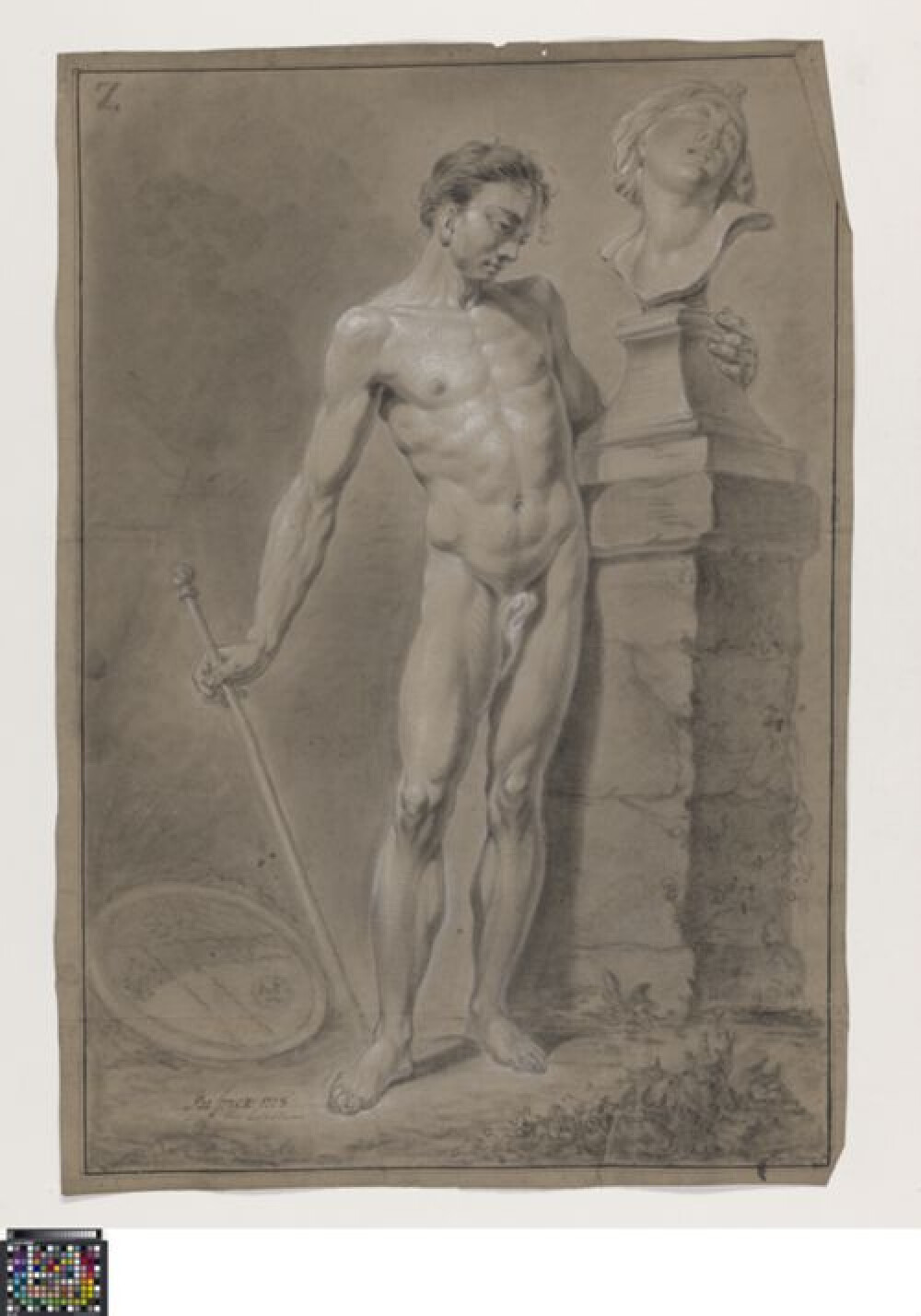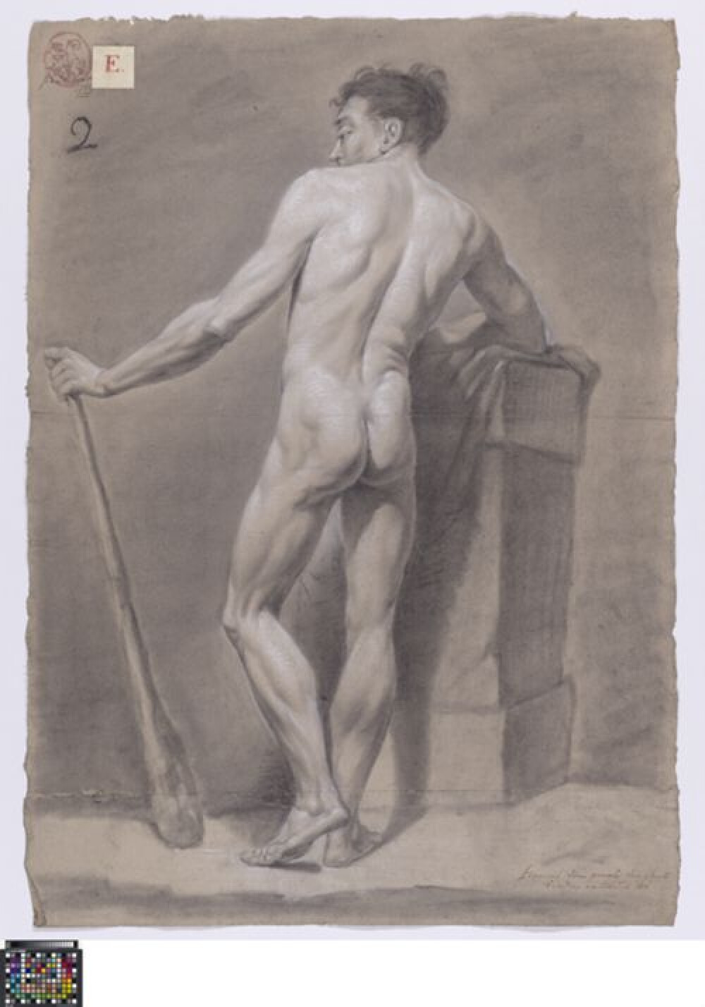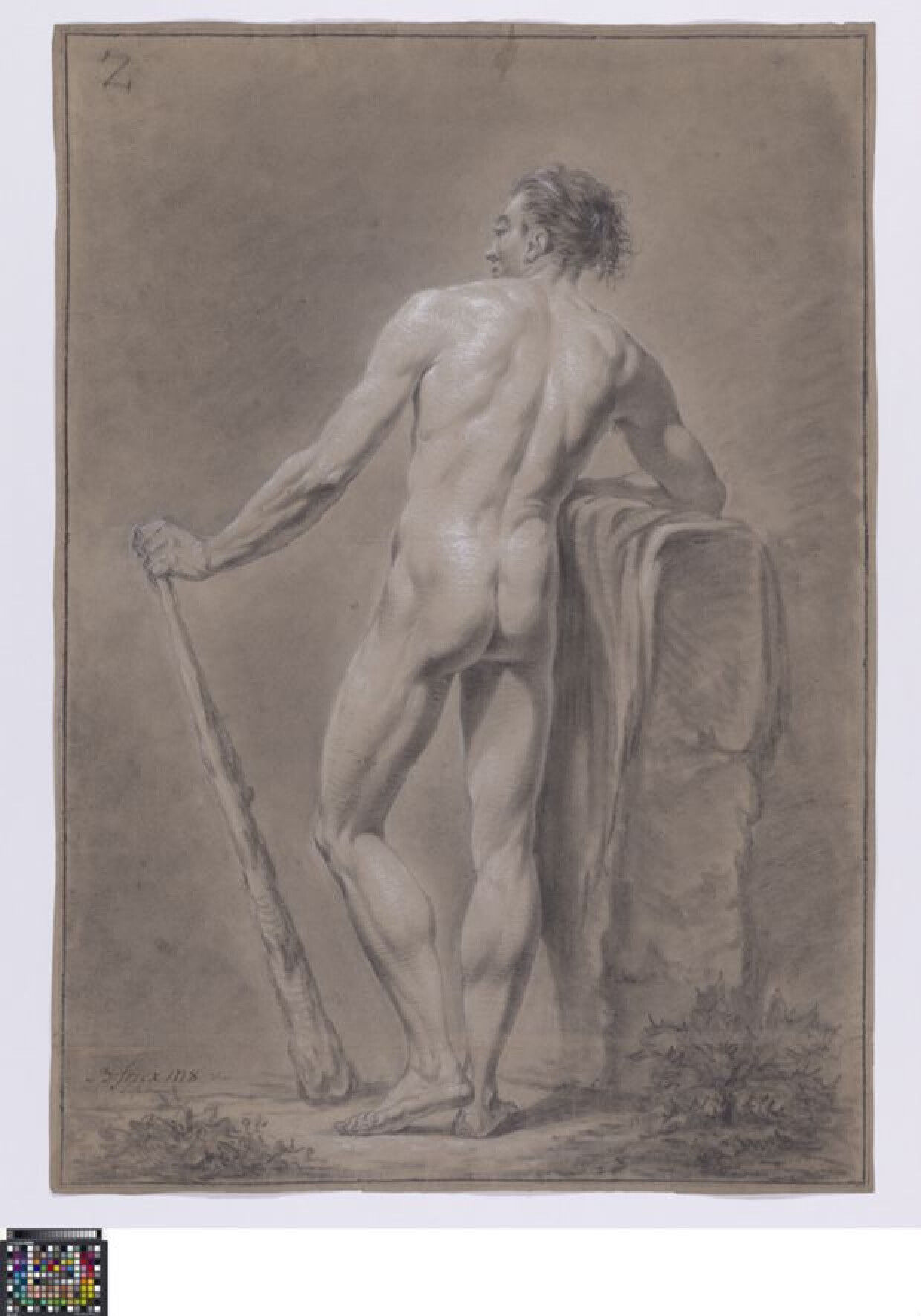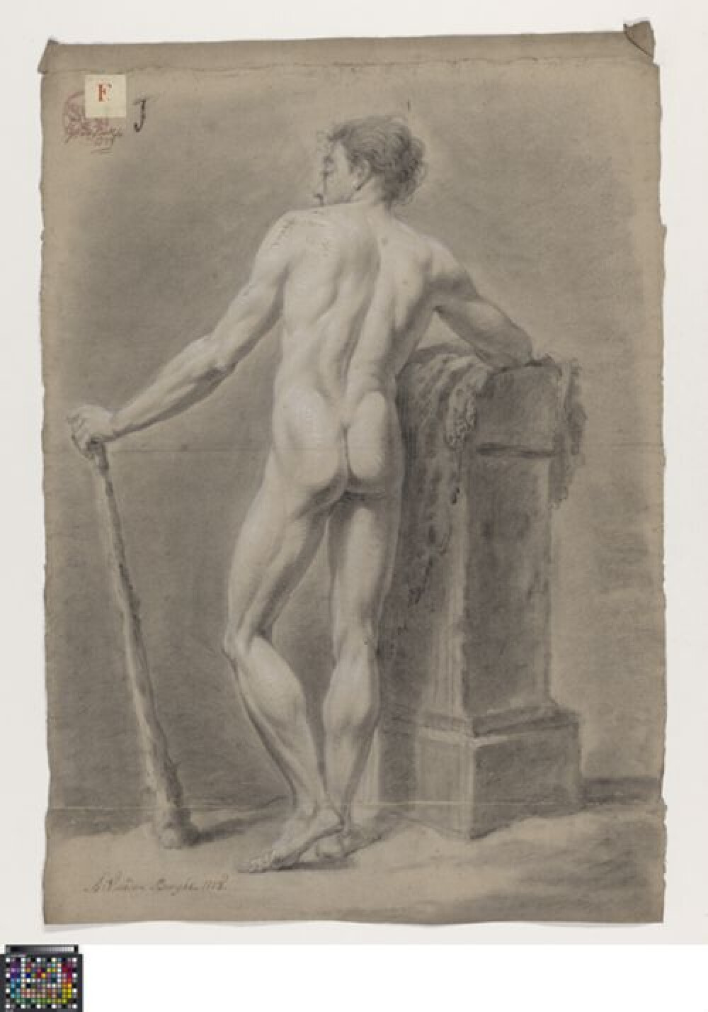 18de eeuwAcademische studie naar levend model van een mannelijk naakt, getekend door Bernardus Fricx in 1778. Fricx maakte deze studie tijdens het prijskamp in de klas naar levend model, maar als liefhebber kon hij geen prijs winnen. Net als de eerste prijswinnaar Augustin van den Berghe (0014.GRO0093.II), en de tweede prijswinnaar Franciscus van Paemel (0016.GRO0055.II) tekende hij het poserende model, staand van op de rug gezien met een knots. Het model wordt in contrapost afgebeeld, leunend tegen opeengestapelde rotsblokken waarop een doek gedrapeerd is. In zijn linkerhand houdt de naakte man een knuppel vast die tot op de grond reikt. Hij kijkt in profiel naar links. In de voorgrond is er plantengroei weergegeven. De studie is getekend in zwart krijt of houtskool met hoogsels in wit krijt. De volledige compositie wordt omkaderd door een dubbele lijn in zwart krijt. Daarrond werd het tekenpapier afgesneden. Onderaan is een papierstrook verlijmd waarop de voorstelling doorloopt. Hierop werd de naam van de tekenaar toegevoegd, na de wedstrijd, met de aantekening dat hij 'voor liefhebberie' tekende. Het tekenpapier draagt noch de academiestempel, noch een handtekening. De tekenletter 'Z' van Fricx is wel in de linkerbovenhoek geschreven. Fricx maakte ook een tweede studie van het frontaal poserende model: 0014.GRO0092.II. Ook Albertus Riethage tekende als liefhebber en maakte twee studies: 0016.GRO0057.II en 0016.GRO0058.II.