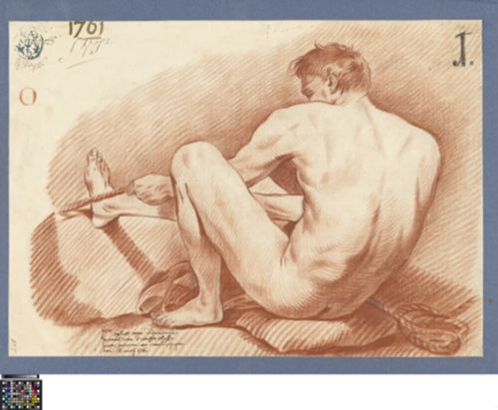 18de eeuwAcademische studie naar prent van Antonius de Grote, getekend door J. Colnet in 1761. Colnet werd toen primus van de wedstrijd in de eerste klas naar prenten, ook 'eerste principien' of 'beginselen' genoemd aan de Academie Brugge. Volgens het opschrift was Colnet afkomstig uit Duinkerke. Tijdens het prijskamp tekende de leerling de buste van de heilige Antonius de Grote of Antonius van Egypte. De pestheilige is afgebeeld als kale man met een lange baard. Hij draagt een mantel met een kap en kijkt in profiel naar rechts. De stok met het vastgebonden klokje is het attribuut van de heilige. De leerling kopieerde een prent van Pitteri (graveur) naar ontwerp van Piazzetta. Rond de tekening is een kader getrokken. Het gebruikte medium is rood krijt met een ondertekening in zwart krijt of houtskool. Op de studie zijn verschillende aantekeningen, gerelateerd aan Colnet's wedstrijddeelname. Linksboven staat de academiestempel met de handtekening van directeur Matthias de Visch en leraar Jacques de Rijcke. Een derde handtekening werd nog niet geïdentificeerd, maar zou van de secretaris kunnen zijn. De letter 'O' linksboven is de tekenletter van Colnet waarmee de wedstrijdjury zijn studie anoniem kon beoordelen. Het cijfer 1 (J.) in de rechterbovenhoek, duidt aan dat hij primus werd. De wedstrijdannotatie rechtsonder vermeldt de naam van de leerling-tekenaar, zijn afkomst en behaalde prijs. De tekening wordt bewaard in een album met andere wedstrijdtekeningen naar prent. Daarin bevindt zich een tweede studie van Colnet (0016.GRO0141.06.II), getekend voor dezelfde wedstrijd.