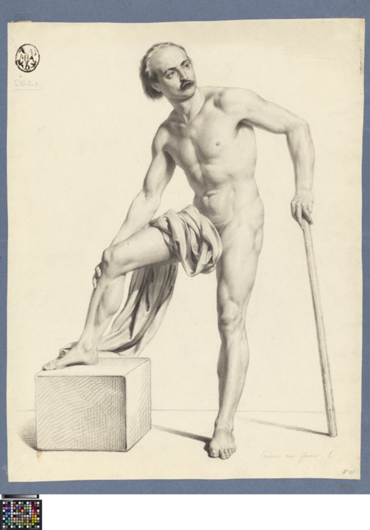 19de eeuwAcademische studie naar prent van een mannelijk naakt, getekend met zwart krijt of houtskool. De tekenaar van deze studie is niet bekend maar volgde wellicht les in de eerste klas naar prenten aan de Academie Brugge. De aantekening duidt wel aan dat de tekening gemaakt werd in een 'concours voor plaetse', of wedstrijd voor het tekenen om plaatsen. De leerling-tekenaar werd eerste met deze studie. Het afgebeelde onderwerp is een naakte man die staand poseert met een stok in zijn linkerhand. De man is in driekwart naar links weergegeven, zijn hoofd gedraaid naar de andere kant. Hij richt zijn blik naar boven. Zijn rechtervoet steunt bovenop een vierkante sokkel en over zijn been ligt een doek gedrapeerd. Deze studie werd getekend naar een prent (lithografie) van Julien uit de reeks 'Nouvelles Académies'. De tekening is gekleefd in een album waarin andere tekeningen naar prenten verzameld zijn, tussenin tekeningen uit 1814 en 1818. Hoewel het album grotendeels chronologisch is opgebouwd, kan hierbij voor de datering niet op voortgegaan worden. De handtekening van directeur Wallays linksboven leidt namelijk naar een berekende schatting tussen 1853 en 1887, de periode van zijn directoraat.