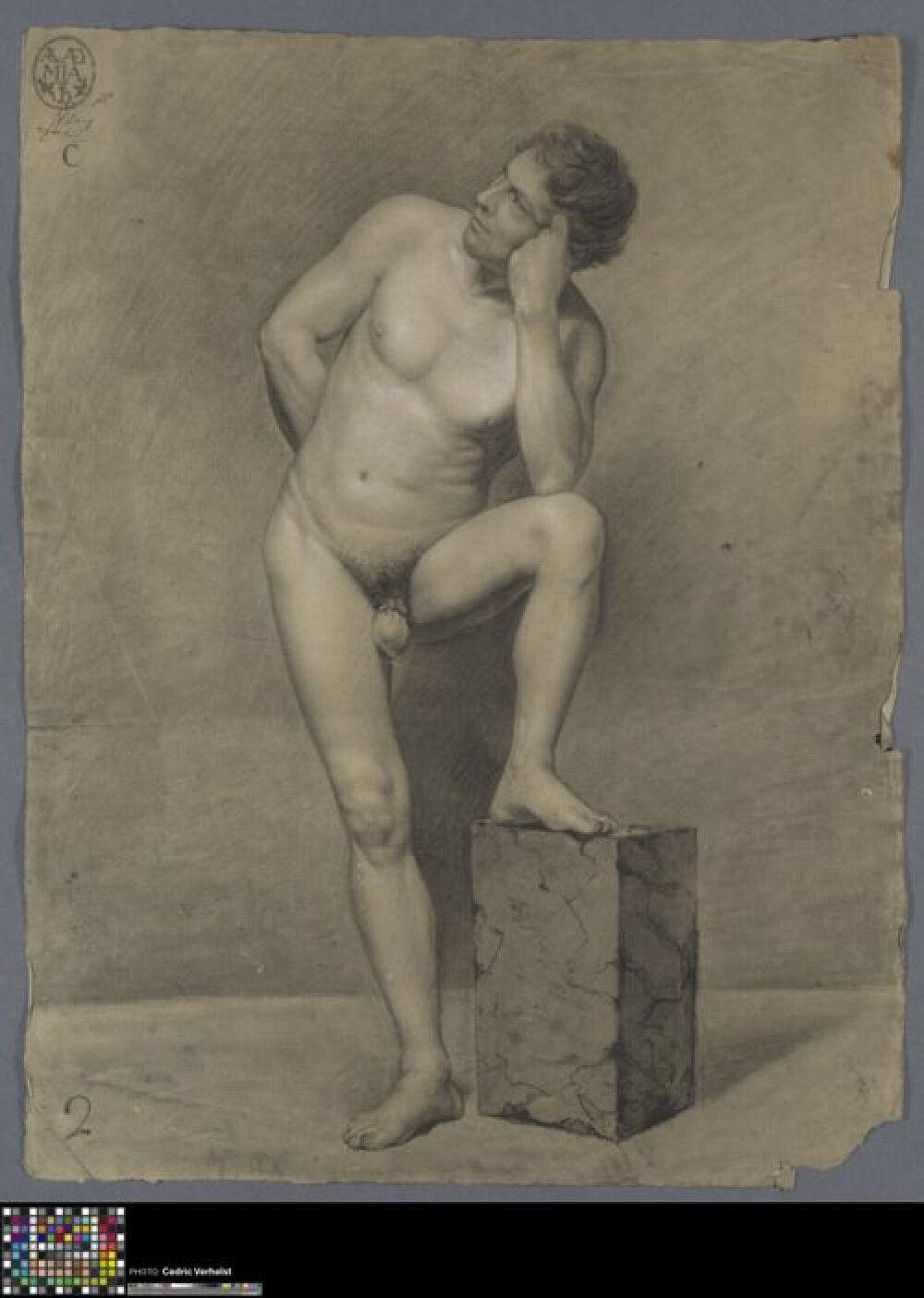 Academische studie van een mannelijk naakt, naar levend model getekend door een leerling van de Academie Brugge. De naam van de tekenaar is nergens vermeld. Het gaat om de wedstrijdstudie van de winnaar. De behaalde plaats of prijs werd linksonder genoteerd: 1 of eerste. De datering is niet vermeld, maar wellicht dateert de studie uit ca. 1826. De handtekening van directeur Ducq en de plaats van de tekening in de tekenmap waarin ze werd bewaard, wijzen hiernaar. De studie is in zwart krijt of houtskool getekend, gehoogd met wit krijt. Het naaktmodel is frontaal afgebeeld. Hij steunt met zijn linkervoet op een sokkel en laat zijn elleboog daarbij op de knie rusten. Zijn hand ondersteunt het hoofd. De man houdt zijn rechterarm achter het lichaam en kijkt in driekwart aanzicht omhoog. De sokkel heeft een bas reliëf met weergave van het hoofd van een soldaat in profiel naar links, een papierrol en een lauwerkrans. Een andere anonieme leerling werd tweede in dezelfde wedstrijd: 0022.GRO0380.II. Op zijn studie is een andere sokkel getekend.