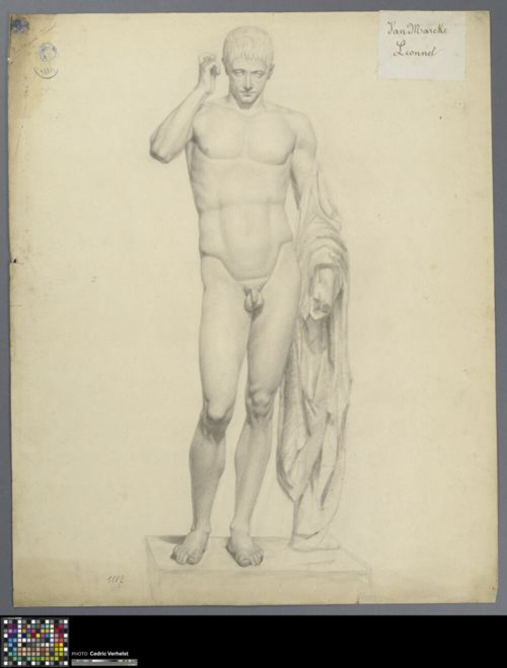 19de eeuwAcademische studie naar sculptuur van Marcellus als Hermes Logius, getekend door Conrard Fleuriau in 1887. Fleuriau studeerde aan de Academie Brugge in de klas "Antiek-beeld" tijdens het schooljaar 1886-1887. Hij nam deel aan een wedstrijd en behaalde de tweede plaats of prijs. Zijn klasgenoot Lionnel Van Marcke werd winnaar: 0022.GRO0665.II. De leerling tekende naar een afgietsel van het beeldhouwwerk Marcellus als Hermes Logios. De sculptuur is vanuit driekwart aanzicht getekend in zwart krijt of houtskool. De linker bovenhoek van het tekenpapier was omgeplooid om de naam van de leerling te verbergen tijdens de wedstrijd. Dit garandeerde een objectieve beoordeling door de jury.