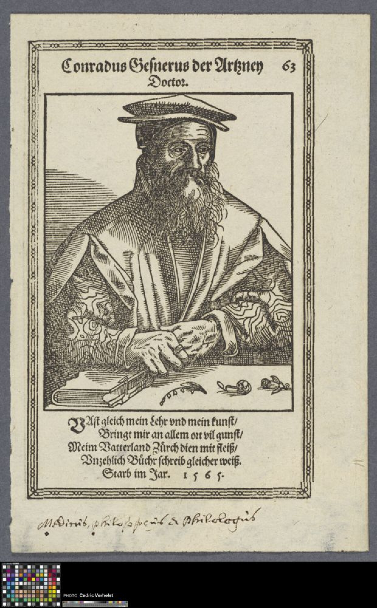 16de eeuwPortret van Conrad Gesner of Gesnerus (26 maart 1516 - 13 december 1565), Zwitsers natuurwetenschapper, arts, botanicus en één van de grondleggers van de zoölogie. In dit busteportret wordt hij frontaal afgebeeld met het gezicht in driekwart aanzicht naar rechts. De natuurkundige draagt een baret en een cape over een kleed met brokaatmotieven. Hij zit aan een tafel waarop een boek en specimens liggen. De houtsnede is de 63ste illustratie uit het "Contrafacturbuch" van Nikolaus Reusner, uitgegeven bij Bernhard Jobin in 1587. Dit boek bevat 103 portretten van hervormers, protestanten, gereformeerden en humanisten. Elk portret is omkaderd door een rechthoekige lijst met parelmotief en voorzien van een begeleidend opschrift in boekdruk onder de voorstelling. Volgens het voorwoord zouden de beeltenissen teruggaan naar tekeningen van Tobias Stimmer, Johan Holbein en Christoph Maurer. De prent maakt deel uit van een album met (losse) portretten uit de 16de en 17de eeuw (2014.GRO0019.III).