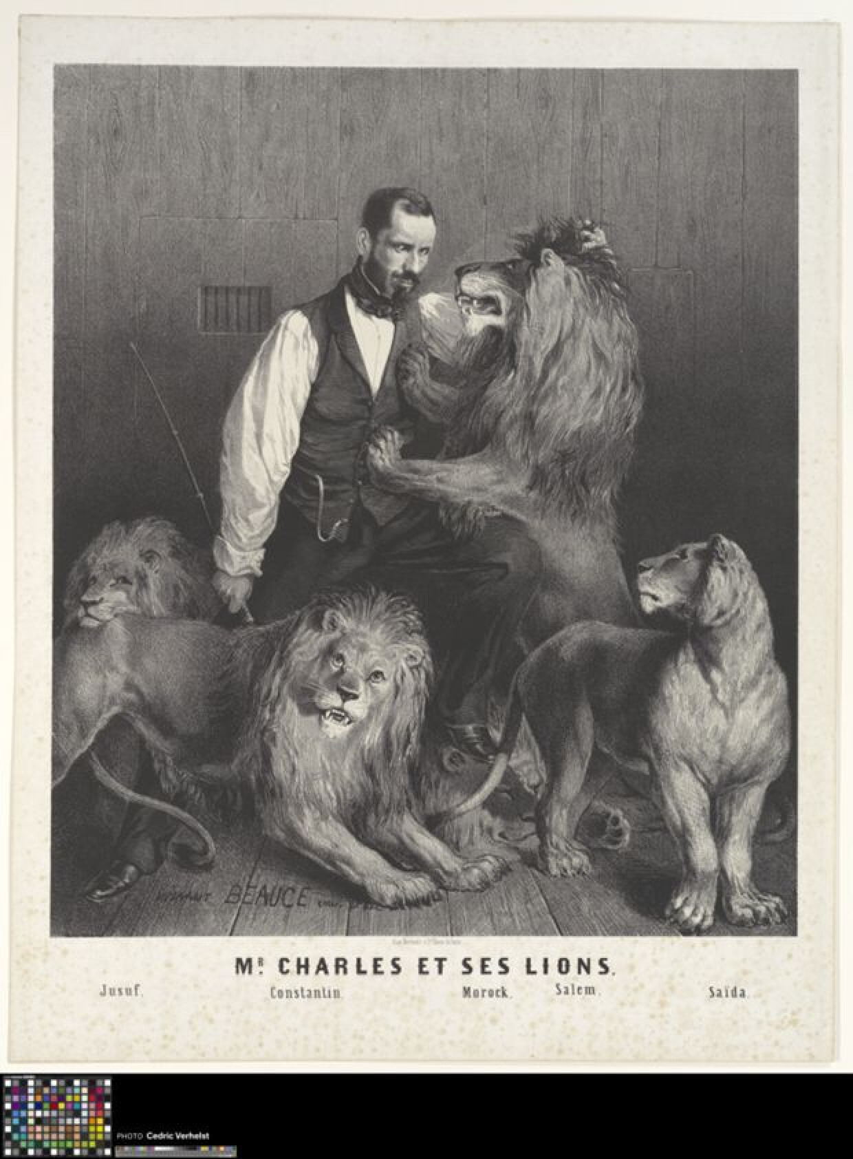 19de eeuwDe voorstelling toont een zekere Charles en vijf leeuwen. Zij heetten, van links naar rechts en laag naar hoog: Jusuf, Constantin, Morock, Salem en Saïda. Zie ook pendant.