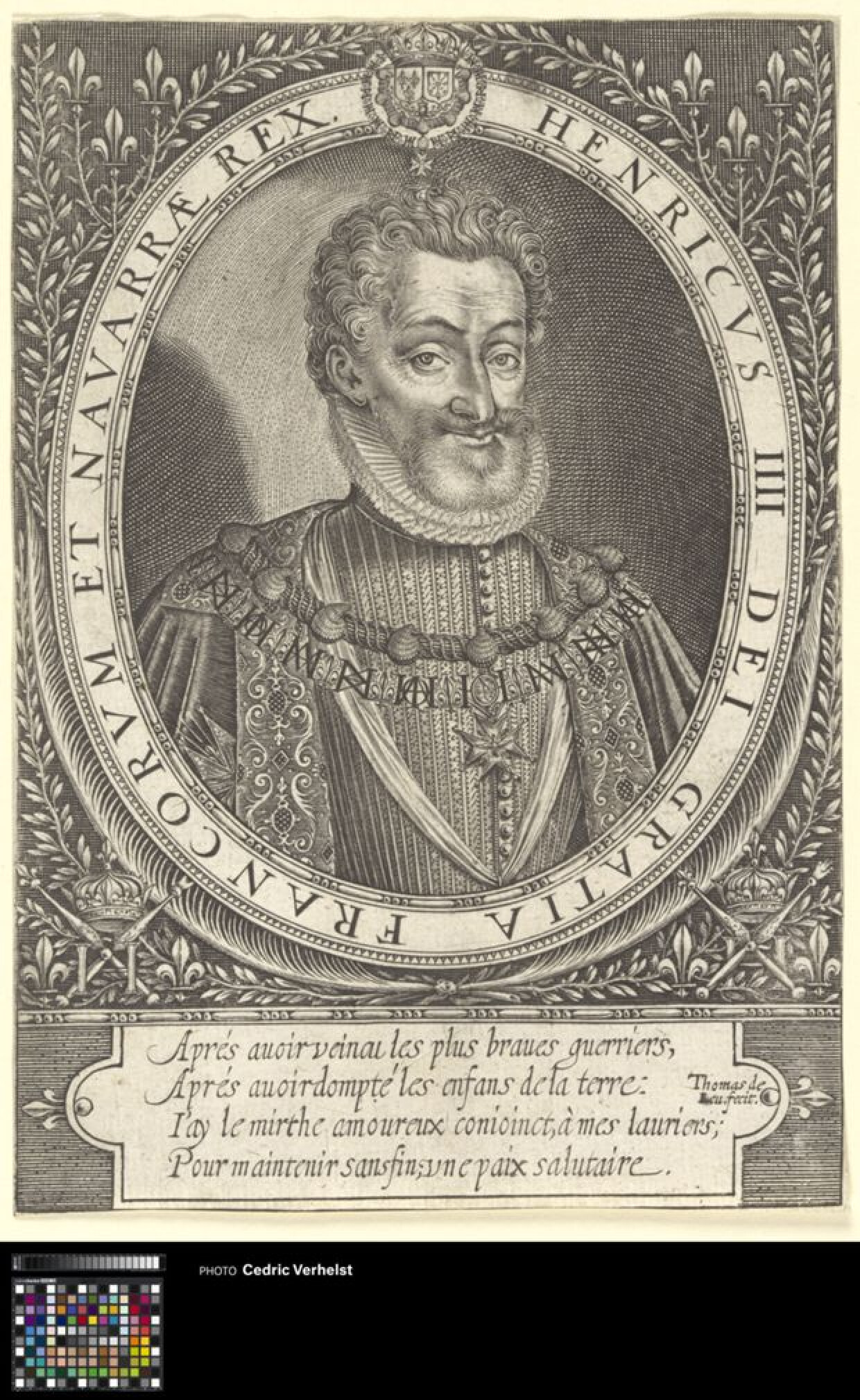19de eeuwPortret van Hendrik IV, ten halve lijve, in een ovale lijst. Het lichaam is iets gedraaid, de ogen kijken de toeschouwer aan. Hij heeft kort krullend haar, een snor en een baard. Hij draagt een rijk versierde mantel, met een motief op de panden en knopen langs de voorkant. Hij heeft een geplooide, opstaande kraag om. Om zijn schouders hangt een gedraaide ketting versierd met schelpen, en eronder nog een ketting met zwarte decoratie (gelijkend op Romeinse cijfers). Aan de ketting hangt een hanger in de vorm van een vierpuntige ster met erin een vogel - het teken van de Orde van de Heilige Geest. In de ovale lijst is de naam van de koning gedrukt, rondom het portret. In de bovenkant van de lijst is een familiewapen afgebeeld. Rondom de ovale lijst is de prent versierd met een bladermotief en Franse lelies tegen een donkere achtergrond. In beide hoeken, aan de onderkant, is een letter H en een kroon verwerkt. Onder de voorstelling is een Franse tekst van vier regels gedrukt.