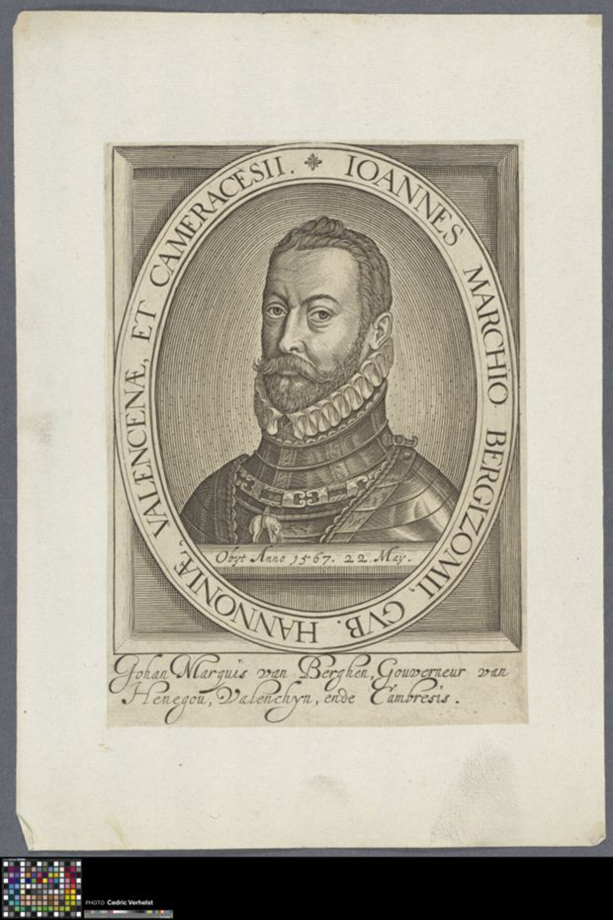 17de eeuwBusteportret van Jan IV van Glymes (Bergen op Zoom, 1528 - Segovia, 1567). Hij was een Nederlandse edelman en heer van Glimes, markies van Bergen op Zoom. Daarnaast was hij graaf van Walhain in Brabant en stadhouder van Henegouwen. Hij is in buste naar links afgebeeld in een ovalen omlijsting met inscriptie. Hij heeft een lange snor en baard. Hij bevindt zich achter een borstwering en draagt een harnas met plooikraag. In de marge onderaan is een tweeregelig opschrift in het Nederlands te lezen. De prent behoort tot een reeks portretten uit "Tooneel der beroemder Hertogen, Princen, Graven ende Krygs-helden" gepubliceerd door Nicolaes de Clerck. Maakt deel uit van het album met (losse) portretten uit de 16de en 17de eeuw (2014.GRO0019.III).