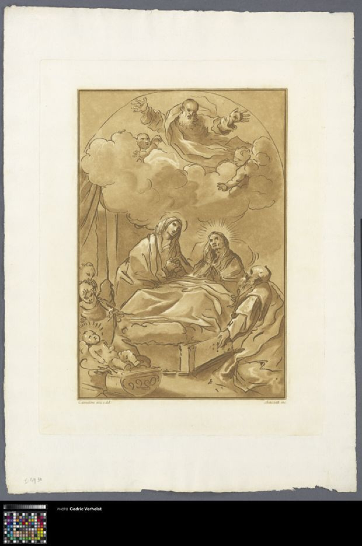 18de eeuwDeze prent toont het sterven van de Heilige Anna. Anna is in het midden afgebeeld, half rechtop in een bed. Zij heeft haar handen gevouwen in gebed en haar ogen naar de hemel gericht. Boven haar hoofd zweeft God omringd door twee engeltjes boven een wolk. Rechts aan het bed van Anna zit Maria, ook in gebed. Links zit een geknielde man. Aan het voeteneinde van het bed staat een kribbe met het Christuskind. Achter hem staat een engel die een stuk stof ophoudt. De voorstelling wordt omkaderd door een rechthoekige lijst. Onder de lijst staan de namen van de makers gedrukt.