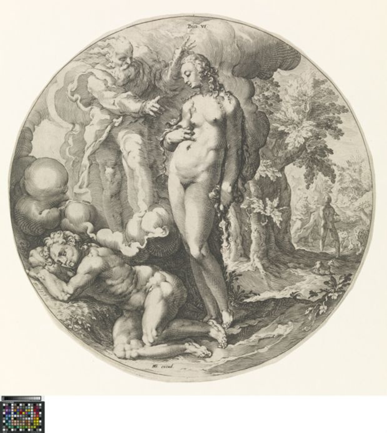 16de eeuwIn het midden van de voorstelling is Eva voluit afgebeeld. Links van haar is een verschijning van God te zien. Op de grond links ligt Adam te slapen. Op de achtergrond rechts worden de dieren geschapen. De prent is gemaakt door Jan Harmensz. Muller naar Hendrick Goltzius en is de zesde in een reeks van zes prenten met voorstellingen van de schepping van de wereld (New Holl. The Muller Dynasty II, 35-41, 41).