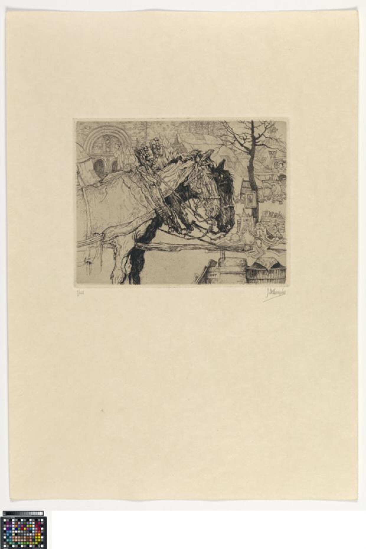 Twee ingespannen paarden zijn met kop en voorbenen in profiel naar rechts weergegeven. In de achtergrond een antiekmarkt voor een kerkportaal. Deze prent maakt als nummer 6 deel uit van het zevende, complete exemplaar van het album 'Sites et Vision de Gand' uit 1932.