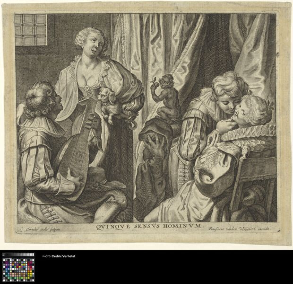 17de eeuwInterieur met vijf menselijke figuren en een aapje. Samen beelden zij de vijf zintuigen uit. Links speelt een man op een luit, en de vrouw die tegenover hem staat luistert (gehoor). In het midden zit een aapje dat een stuk fruit eet (smaak) boven een figuur die zijn ogen bedekt (zicht). Rechts probeert een jongen een meisje te kussen; hij houdt haar gezicht vast (tast) en ruikt aan haar nek (geur). Van het interieur is niet veel te zien, behalve een raam links in de hoek, en zware gedrapeerde gordijnen achter de figuren. De prent is gemaakt naar een prent van Jacob Lys. De titel bij Lys is omschreven in Hollstein als "Interior with two couples of lovers and a fool". Interessant is dat de voorstelling bijna exact hetzelfde is, maar dat Galle het aapje en het venster heeft toegevoegd. In Hollstein word de prent van Galle dan weer "the brothel" genoemd. De tekst onder de prent, die op de Vijf Zintuigen wijst wordt niet beschreven bij Lys en lijkt dus ook een toevoeging van Galle te zijn. Galle vermeld op zijn print overigens niet dat hij het werk naar Lys heeft gemaakt.
