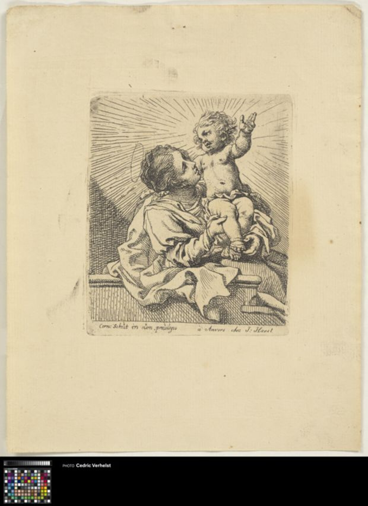 17de eeuwDe ets toont Maria met het Christuskind. Maria is ten halve lijve achter een verhoging afgebeeld, met het lichaam sterk naar rechts gedraaid. Het kind zit tegen haar schouder aan, met zijn voetjes in haar handen. Hij heeft zijn rechterarm om haar nek geslagen en heft de linkerarm op. Maria kijkt naar hem op, terwijl hij naar links kijkt. Maria heeft een cirkelvormige aureool boven het hoofd. De aureool van het kind bestaat uit lichtstralen die een contrast vormen met de schaduw in de linkerkant van de voorstelling. Onder de ets staan de naam van de prentmaker en de uitgever gedrukt.