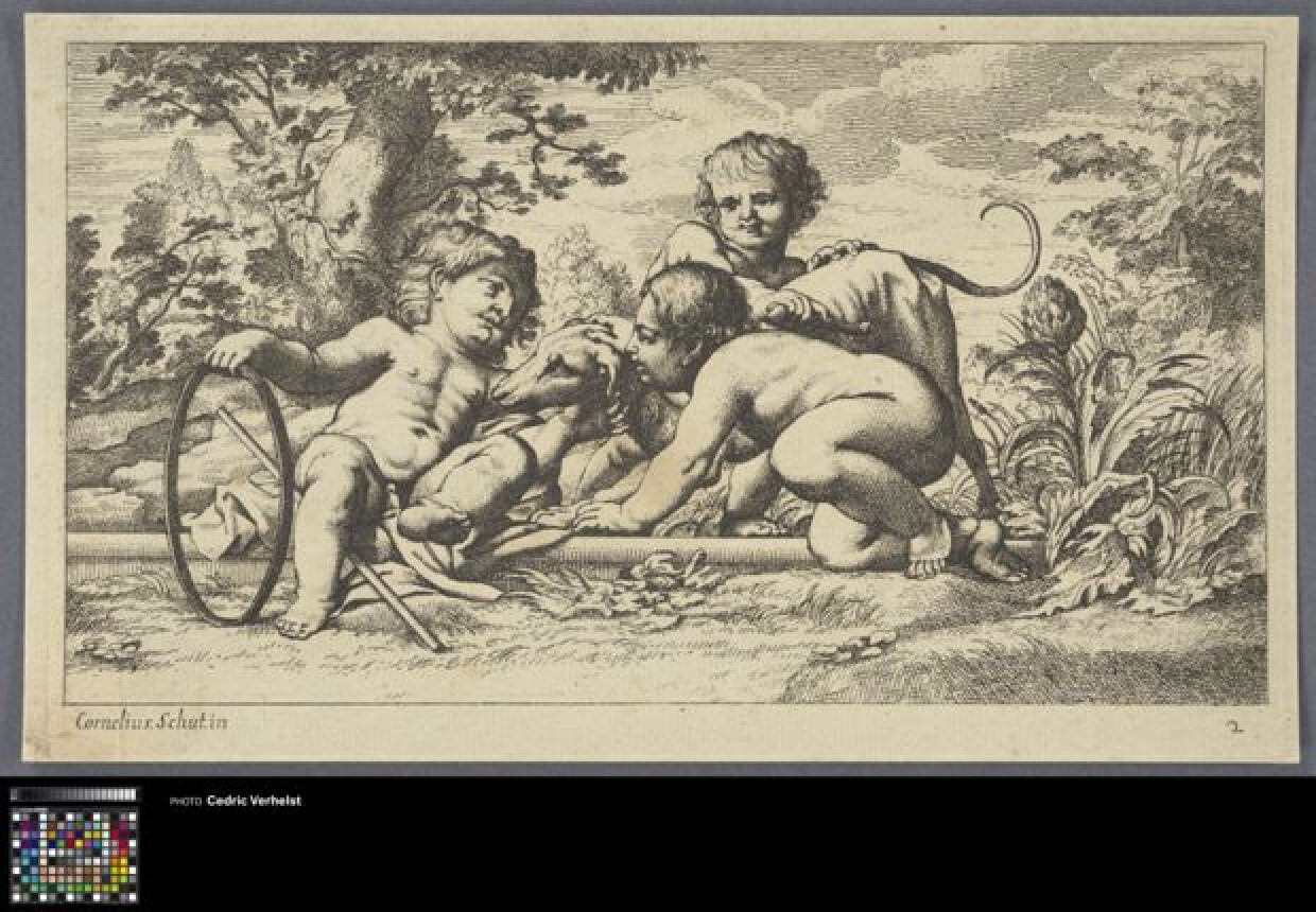 17de eeuwDrie naakte putti spelen met een windhond. De putti links houdt een hoepel en een stok vast en pakt met zijn linkerhand het puntje van het oor van de hond vast. Achter de hond staat nog een putti, met linkerhand op de hand van de rug en een bot in de rechterhand. Vooraan knielt een derde putti naast de hond neer en streelt zijn kop. Het tafereel speelt zicht af in een landschap met bomen en rechts in de voorstelling een artisjok op een steel.