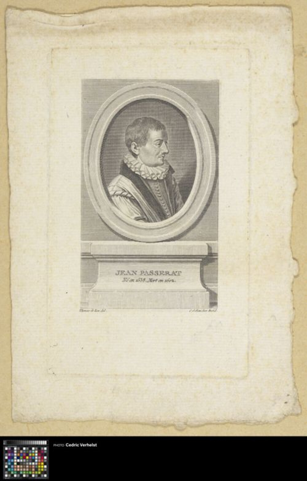 18de eeuwPortret van Jean Passerat (1534-1602) in een ovaal. Hij is afgebeeld in profiel naar rechts. Hij draagt een kanten kraag en een mantel. Passerat was een Frans dichter en satiricus. Vroege staat zonder lettering op het voetstuk.