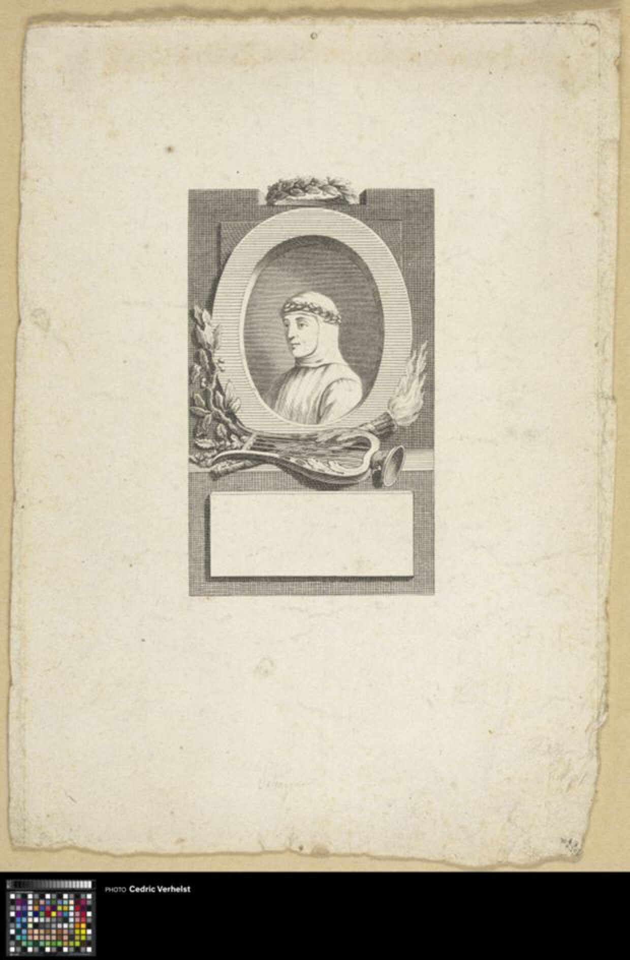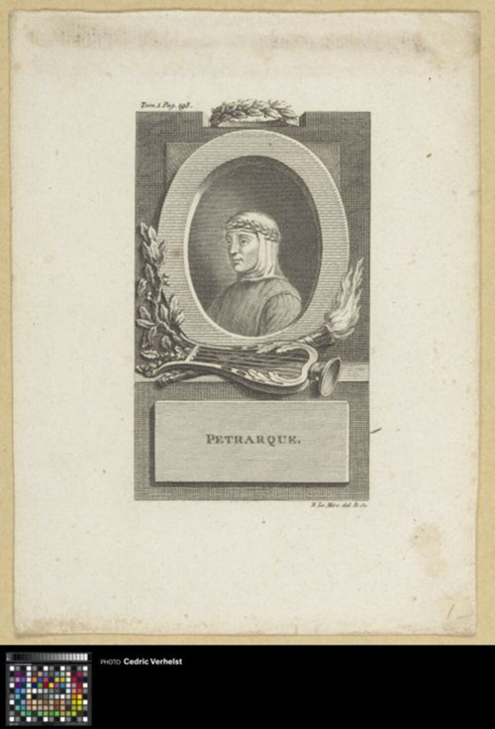 18de eeuwBusteportret van Petrarca (1304-1374), humanistisch dichter, in een ovaal. Hij is een kwartslag naar links gedraaid. Hij wordt vergezeld van laurierbladeren, een harp en een fakkel. Boekillustratie. Eerdere staat zonder lettering en minder detaillering waaronder schaduw in het gezicht.