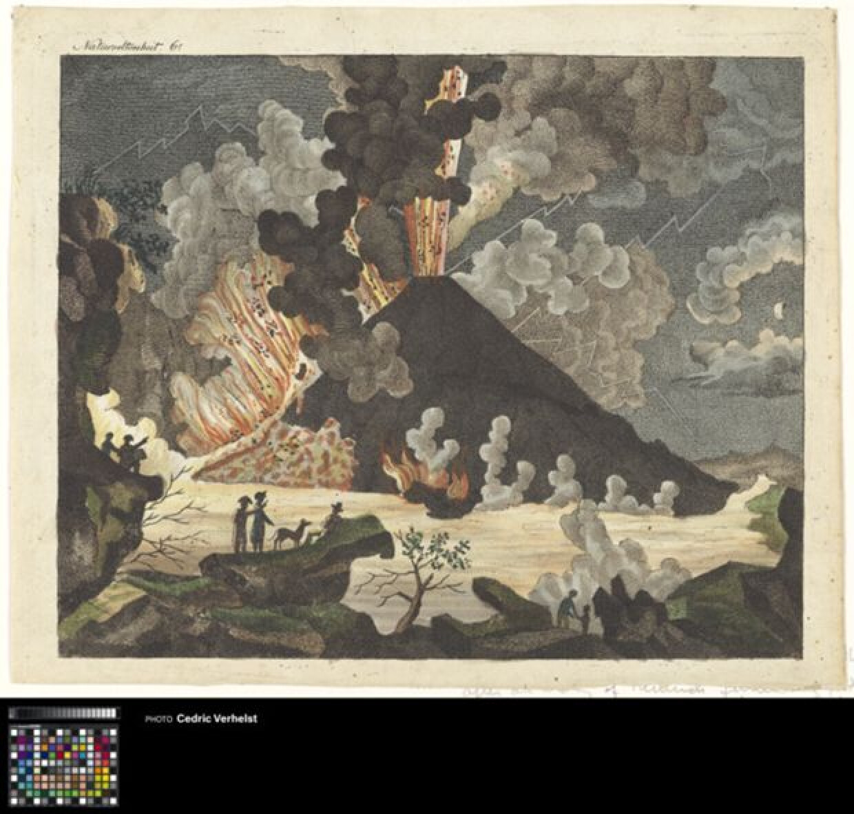 19de eeuwDe ets is gedrukt op een met de hand gekleurd papier. De voorstelling toont een uitbarsting van de Vesuvius, vulkaan in de buurt van Napels Italië. Twee groepen mensen staan op de voorgrond afgebeeld. De vulkaan spat lava, rook, vuur en puin. De voorstelling lijkt gebaseerd op de prent van Heinrich Guttenberg over de uitbarsting van de Vesuvius in 1771. Op zijn beurt is die prent geïnspireerd op het schilderij van de Vesuvius van Pierre Jacques Volaire (1729-1799).