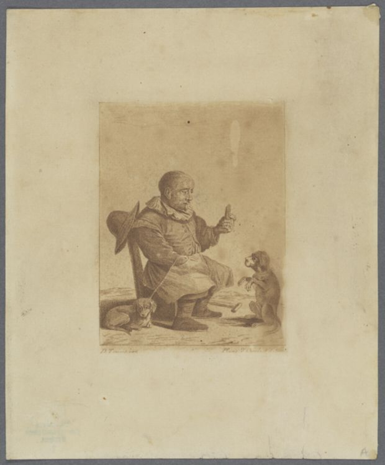 18de eeuwDeze tekening toont een genrestuk, waarin een oude man te zien is, zittend en bezig met het opvoeden van een hond. De man houdt zijn linkerhand op met een soort gebaar alsof hij een commando geeft of een les onderwijst. Hij kijkt naar de hond met een gevoel van verwachting of instructie. De hond zit op zijn achterpoten en lijkt aandachtig naar de man te kijken. Aan de voeten van de stoel ligt een andere hond van hetzelfde ras aan de leiband. De sfeer van de tekening is huiselijk en opvoedkundig. De tekening is gemaakt naar Teniers.