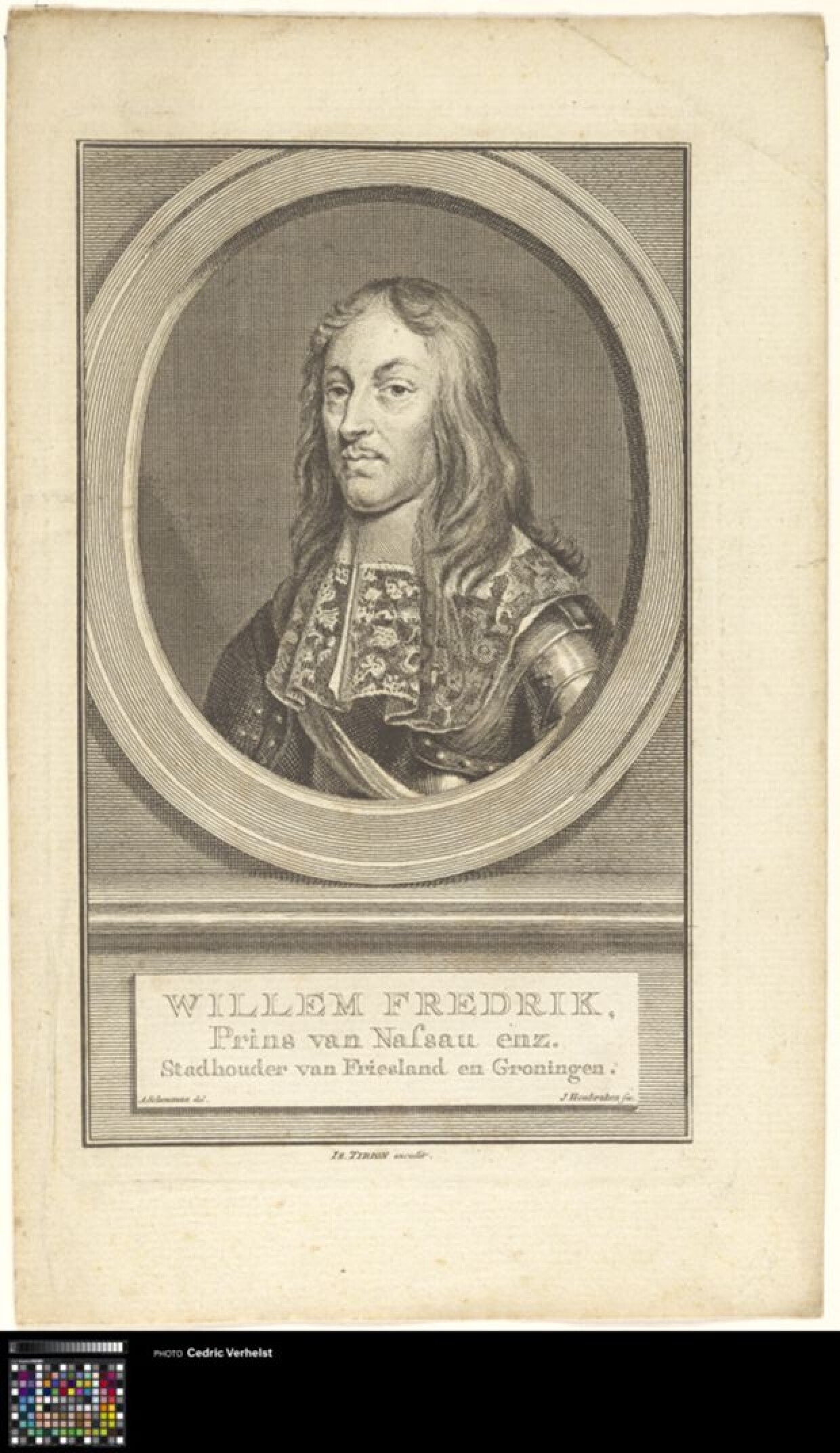 18de eeuwPortret van Willem Frederik, ten halve lijve, binnen een ovaal kader. Het lichaam is gedraaid. Hij heeft lang, glad haar tot over zijn schouders. Hij heeft geen snor of baard. Hij draagt harnas met erover een sjerp en sjaal met motief. De sjaal is onder zijn kin vastgeknoopt en hangt ook over zijn shouder en rug. Het ovalen kader is binnen een rechthoek geplaatst. Onder het kader is een horizontale plint afgebeeld. Het geheel doet denken aan een portret in een ovale lijst dat aan de muur hangt. Onder het portret is in drie regels de naam en titel van de geportretteerde gedrukt, in het Nederlands.