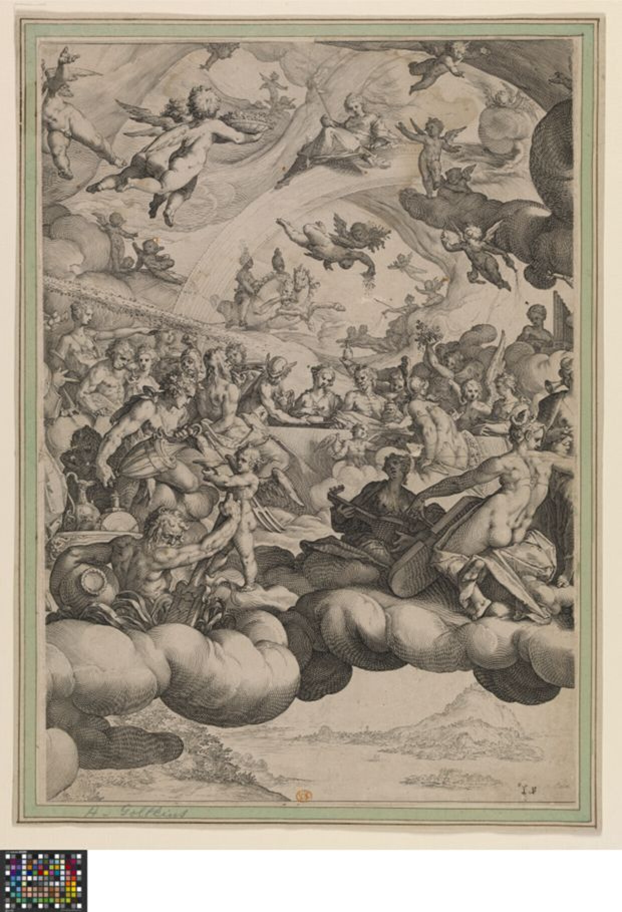 16de eeuwDeze gravure is een onderdeel (één plaat) van een veel grotere prent, bestaande uit drie platen, met het huwelijk van Cupido en Psyche, die Goltzius graveerde naar een ontwerp van Bartholomeus Spranger. Verschillende Romeinse godheden zijn voorgesteld aan het huwelijksmaal van Cupido en Psyche. Centraal zitten Juno en Jupiter. Rechts, aan het hoofd van de tafel zitten de bruid en bruidegom.