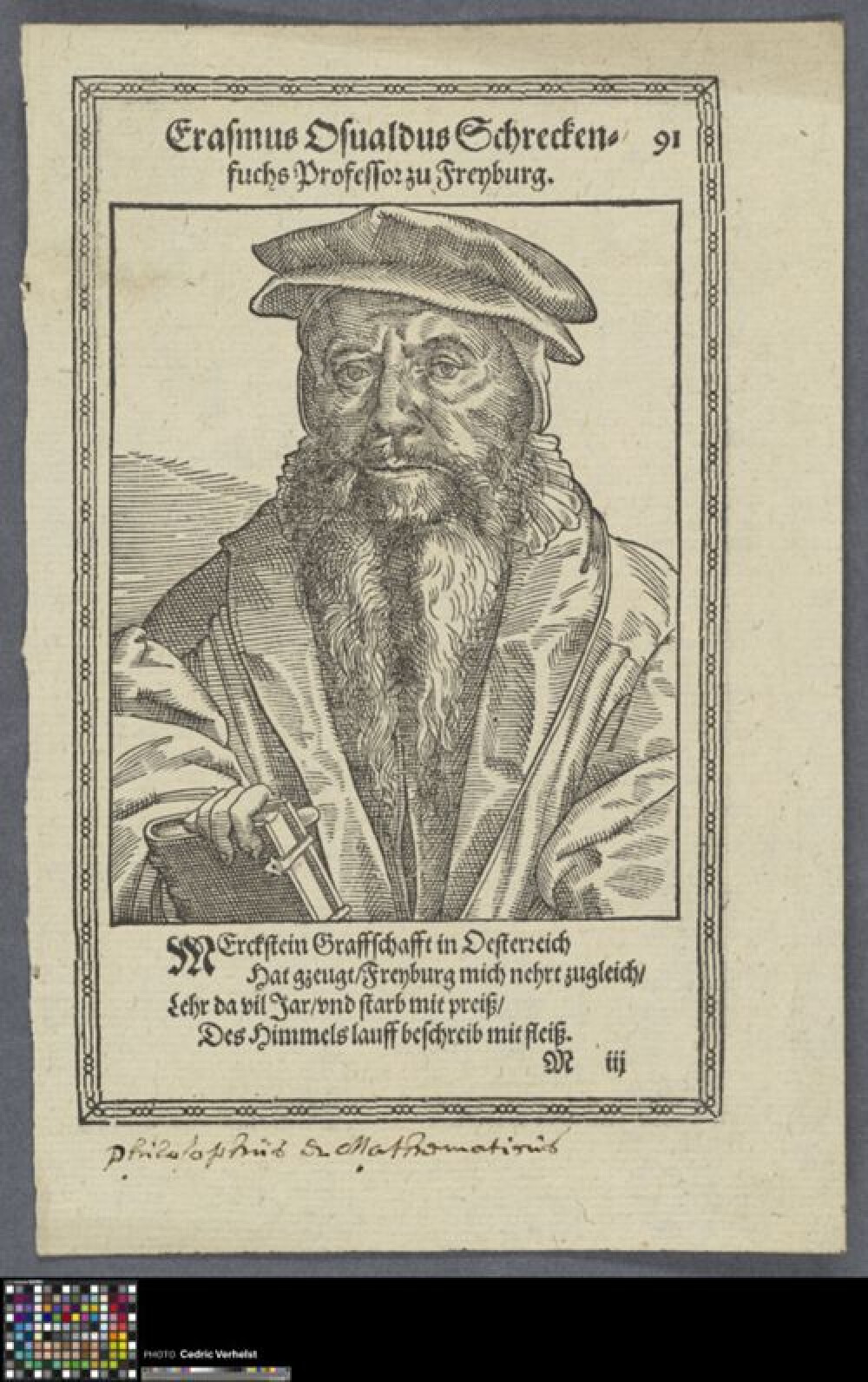 16de eeuwPortret van Hieronymus Wolf (1516 - 1580), Beierse historicus, humanist en filoloog. Hij was de grondlegger van de Byzantijnse historiografie met zijn belangrijk corpus "Historiae Byzantinae". Wolf was verbonden aan de bibliotheek van Augsburg. In Augsburg werd hij ook benoemd tot eerste rector van de Gelehrtenschule in het Sint-Annakarmelietenklooster. De humanist wordt in dit busteportret in driekwart aanzicht naar rechts weergegeven. Hij draagt een baret en houdt een boek vast met beide handen. De houtsnede is afkomstig uit het "Contrafacturbuch" van Nikolaus Reusner, uitgegeven bij Bernhard Jobin in 1587. Dit boek bevat 103 portretten van hervormers, protestanten, gereformeerden en humanisten. Elk portret is omkaderd door een rechthoekige lijst met parelmotief en voorzien van een begeleidend opschrift in boekdruk onder de voorstelling. Volgens het voorwoord zouden de beeltenissen teruggaan naar tekeningen van Tobias Stimmer, Johan Holbein en Christoph Maurer. Het portret van Wolf draagt het nummer 90. De prent maakt deel uit van een album met (losse) portretten uit de 16de en 17de eeuw (2014.GRO0019.III).
