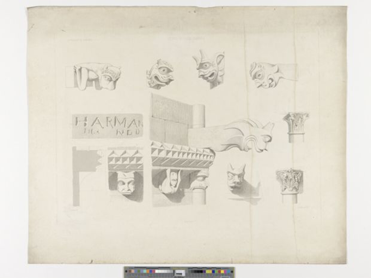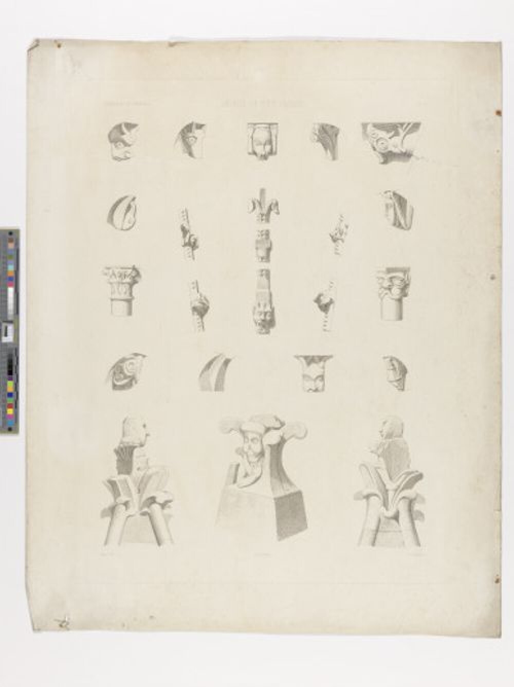 19de eeuwVerschillende architecturale fragmenten van de oude klokkentoren van de kathedraal van Chartres, willekeurig gerangschikt op het blad. Deze prent werd gegraveerd door Auguste-Alexandre Guillaumot naar een tekening van Jean-Baptiste-Antoine Lassus. Ze verscheen als plaat 50 in een reeks prenten uitgegeven door Bougeard.