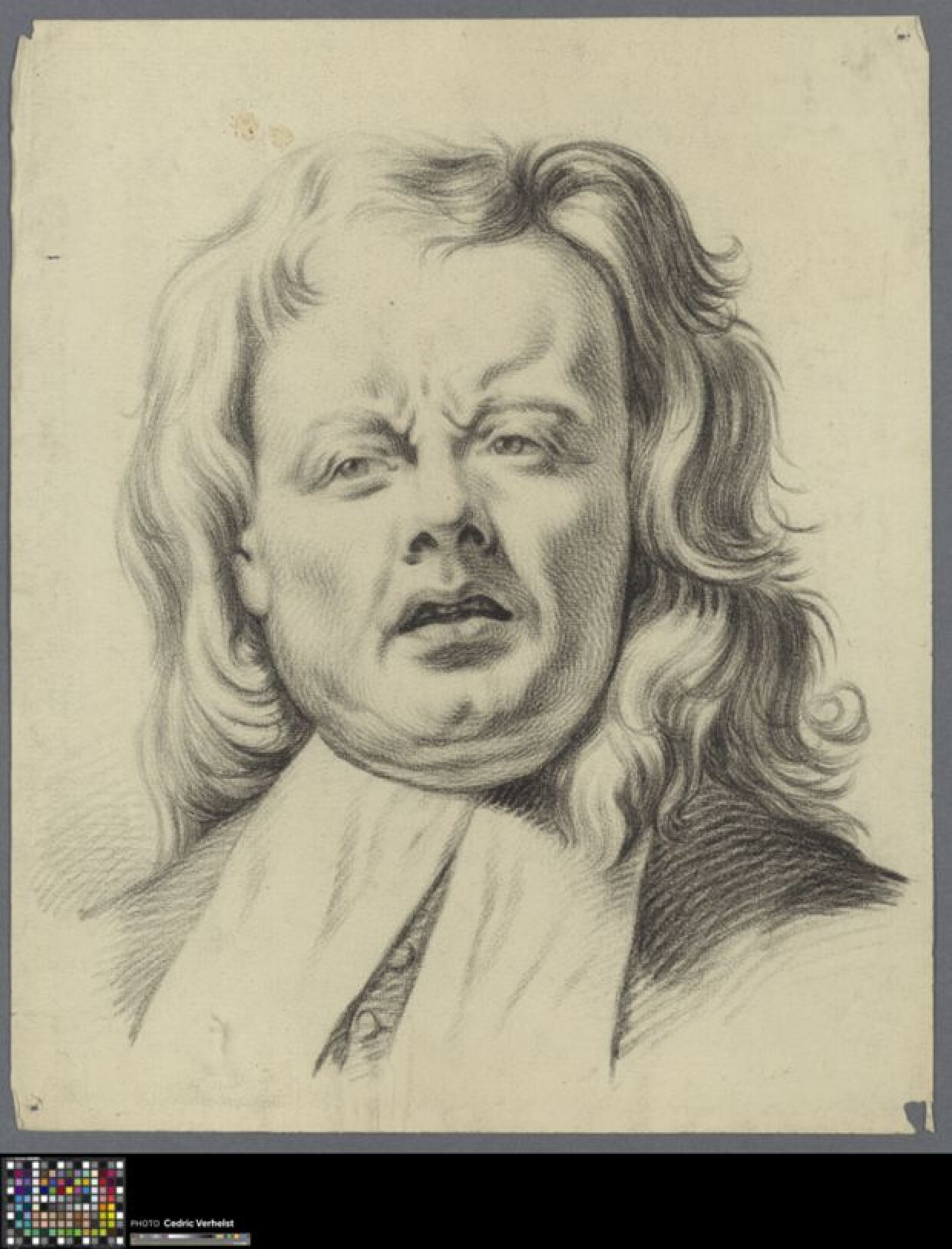 19de eeuwAcademische expressiestudie van een man met verontwaardigde blik, wellicht getekend door een leerling aan de Academie Brugge. Zowel de naam van de tekenaar als de datering is onbekend. De man is frotnaal, tot aan de borst afgebeeld. Hij heeft lang, golvend haar. Hij draagt kledij met knopen en een brede, platte kraag. Het gebruikte tekenmedium is zwart krijt of houtskool. Het werk is getekend naar een studie van Jan Garemijn maar bevat geen aantekeningen die naar de datering verwijzen. De datering van deze studie kan geschat worden op basis van een andere tekening, ook gemaakt naar een 'karakterkop' uit dezelfde reeks van Garemijn (0022.GRO0474.II). Die tekening is door directeur Wallays gesigneerd en gedateerd op basis van zijn directeurschap: ca. 1853-1887. Daarnaast bevat het papier van deze studie een watermerk waarin het jaartal 1857 verwerkt is. Zo komt de datering van deze studie op: ca. 1857-1887.
