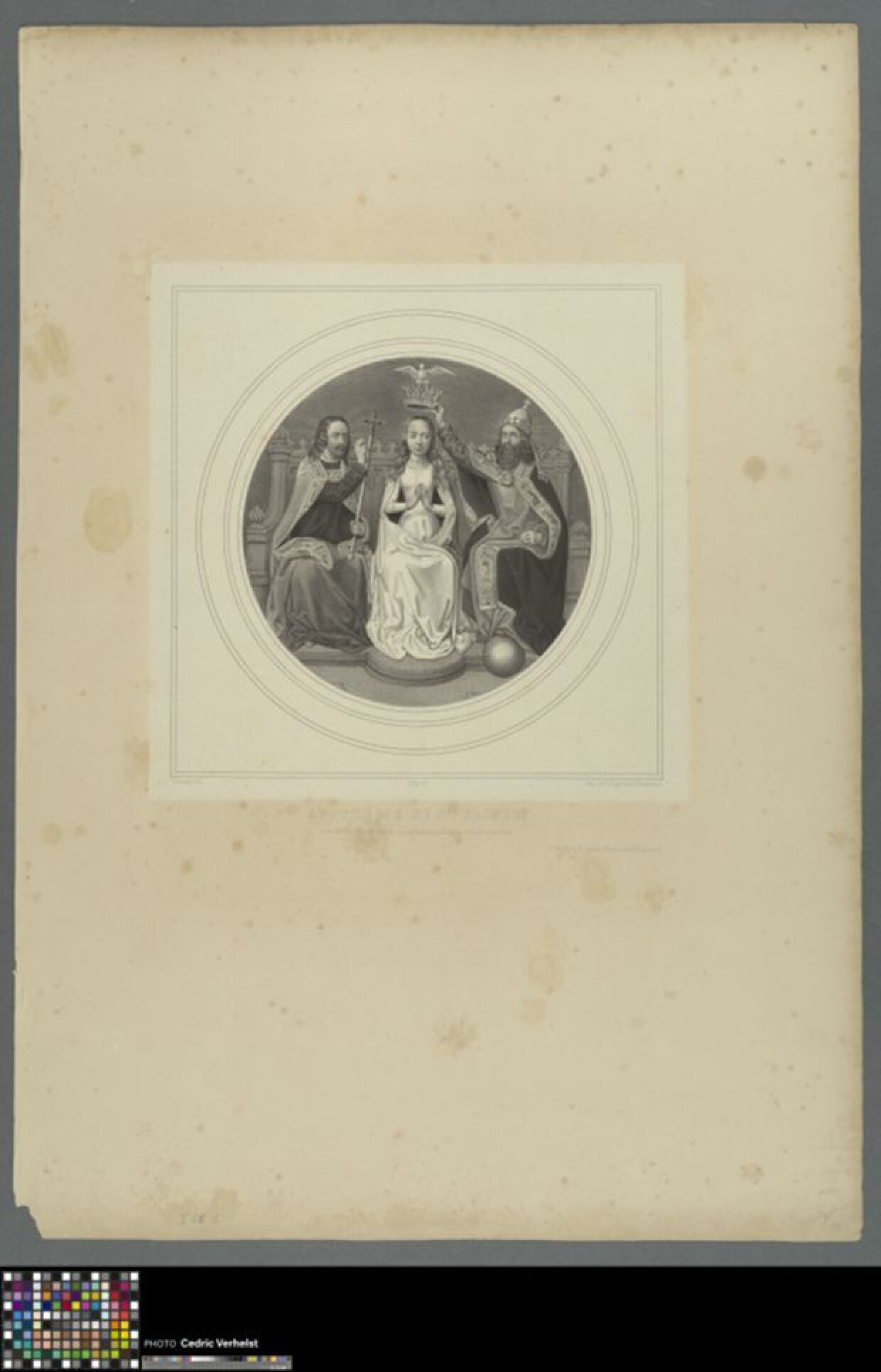 19de eeuwPrent naar het Ursulaschrijn van Hans Memling. Dit is de dertiende plaat uit het album: Châsse de sainte ursule par jean memling: Composé & lith. par Manche & Ghémar, Bruxelles J. Buffa & Bogaert-Dumortier [1841]. We zien de apotheose van de heilige Ursula. God de Vader plaatst op haar hoofd de heilige kroon die de Heilige Geest verlicht met zijn stralen, terwijl God de Zoon de heilige Ursula zegent. Alle vijftien platen uit dit album, behalve de tweede plaat met een portret van Memling en de vijfde plaat met de voorstelling van ‘Arrivée de Ste Ursule à Rome' behoren tot de collectie. Er zijn ook zes tekstbladen aanwezig.
