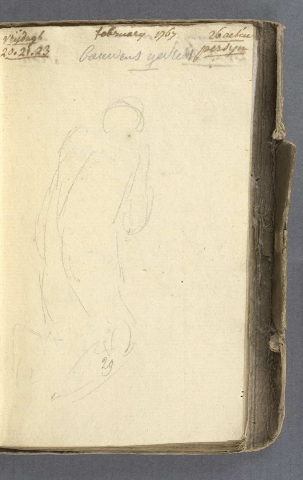 18de eeuw29ste bladzijde [blad 15, recto] uit een notitieboekje van Jan Garemijn als directeur van de Brugse Academie, daterend uit het schooljaar 1766-1767. De pagina bevat een lijnschets van een knielend mannelijk naakt, van op de rug gezien. Het model steunt op beide knieën en zit licht voorovergebogen. Wellicht houdt de man zijn beide handen voor zijn borst. Zo is enkel zijn rechterbovenarm te zien. De schets is uitgevoerd met enkele lijnen in grijs potlood. De focus ligt op de contouren, er zijn geen schaduwen aangebracht. Het gaat om de 26ste actie, geposeerd door het model Persyn op 20, 21 en 23 februari 1767. De notitie bovenaan duidt er vermoedelijk op dat leerling Bernardus Bauwens deze pose gesteld heeft.