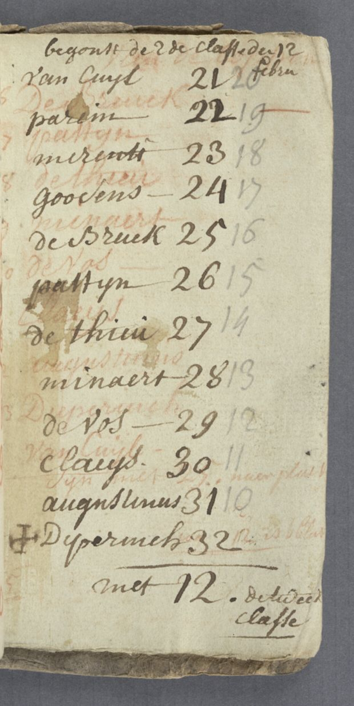 18de eeuw97ste bladzijde [blad 49, recto] uit een notitieboekje van Jan Garemijn als directeur van de Brugse Academie, daterend uit de schooljaren 1771-1772 en 1774-1775. Twee notities zijn hier door elkaar geschreven. De notitie in rood krijt is het vervolg van de lijst op de vorige bladzijde, met nummering links van de namen. De notitie in pen gaat over de 12 leerlingen uit de tweede klasgroep die naar sculptuur (plaaster) tekenden vanaf 12 februari 1772, met hun tekennummers rechts van de namen. Het nummer in grijs potlood werd wellicht toegewezen naar aanleiding van het komende prijskamp.