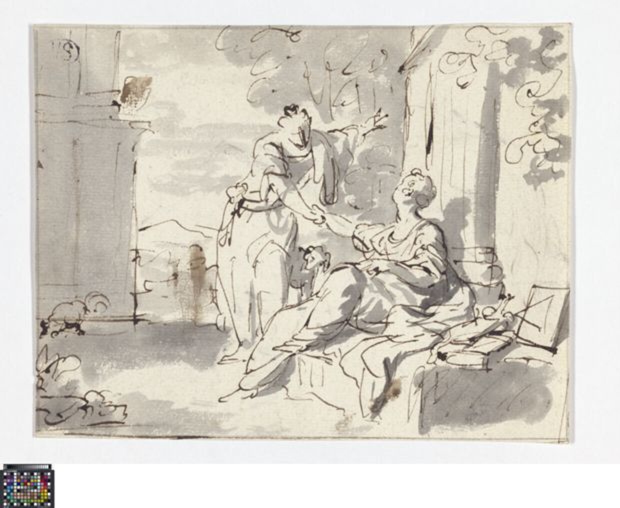 17de eeuwMet een groot gebaar steekt de personificatie van Kennis haar hand uit naar Wetenschap. Die laatste zit op een bank voor een muur. Rondom haar liggen boeken, een tas en instrumenten, waaronder we een zonnewijzer herkennen. Deze tekening die ‘Kennis die de Wetenschap verheft’ uitbeeldt, is een kernstuk in het oeuvre van Jan van Mieris. De vlotte schets is namelijk te verbinden met een schilderij met dezelfde compositie in de Lakenhal in Leiden. Dat werk is gesigneerd en daarom kan deze tekening ook aan Jan van Mieris worden toegeschreven. Kleine verschillen tussen de tekening en het schilderij tonen aan dat Van Mieris zijn compositie bleef aanpassen. Zo is de staande vrouwenfiguur in het schilderij afgebeeld met helm en zo duidelijk te herkennen als Minerva. Terwijl het hondje dat haar in de tekening nog begeleidt, in het schilderij achterwege is gelaten. Door de solide toeschrijving van deze tekening met zijn kenmerkende tekenstijl aan Van Mieris, kunnen er ook andere tekeningen aan hem worden toegeschreven, zoals bijvoorbeeld ‘Socrates en Xanthippe’, eveneens uit het Brugse prentenkabinet (0000.GRO2067.II). De achterzijde van het blad met ‘Kennis verheft de Wetenschap’ toont een pentekening van een hoofd in driekwart gezien van de achterzijde en een hand die een stok vasthoudt. Wellicht is het blad afkomstig uit een schetsboek van Van Mieris.