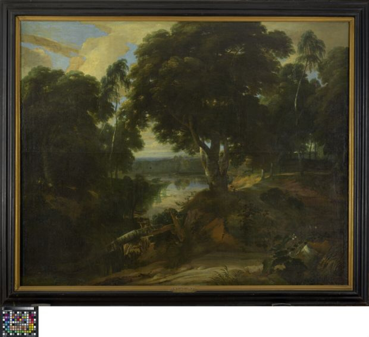 Gezicht op een kronkelende vijver of rivier, waarvan de oevers dicht begroeid zijn met bomen. Dit werk vormt een eenheid met 0000.GRO0002.I en 0000.GRO0002.I. De drie schilderijen hebben nagenoeg dezelfde afmetingen en wellicht dezelfde pedigree. Ook stilistisch is er een opmerkelijke band. Niet alleen kan men spreken van een gelijkaardige schilderswijze, er is ook een gelijkvormige compositiestructuur: het betreft telkens om een landschap, gezien vanuit een hoog blikpunt en met een naar de verte kronkelende weg of waterpartij tussen twee compacte coulissen van bomen. Het is aannemelijk dat de drie werken steeds hebben samengehoord. Van Achtschellinck is geen enkel gesigneerd of gedocumenteerd werk bekend. Er zijn wel een aantal landschappen volgens een oude traditie door deze meester uitgevoerd, met een duidelijke stijlverwantschap aan deze stukken. Met name de brede penseelslag, vooral in de picturale weergave van wegen, wegbermen en boomslag lijken karakteristiek te zijn voor Achtschellinck. Daarnaast vormt de subtiele zilverachtige gradatie van licht en schaduw op de boomstammen, en vooral de berken, een terugkerend stijlkenmerk in de aan Achtschellinck toegeschreven landschappen. (Naar: H. Vlieghe, Stedelijke Musea Brugge. Catalogus Schilderijen 17de en 18de eeuw, Brugge, 1994, pp. 12-13)