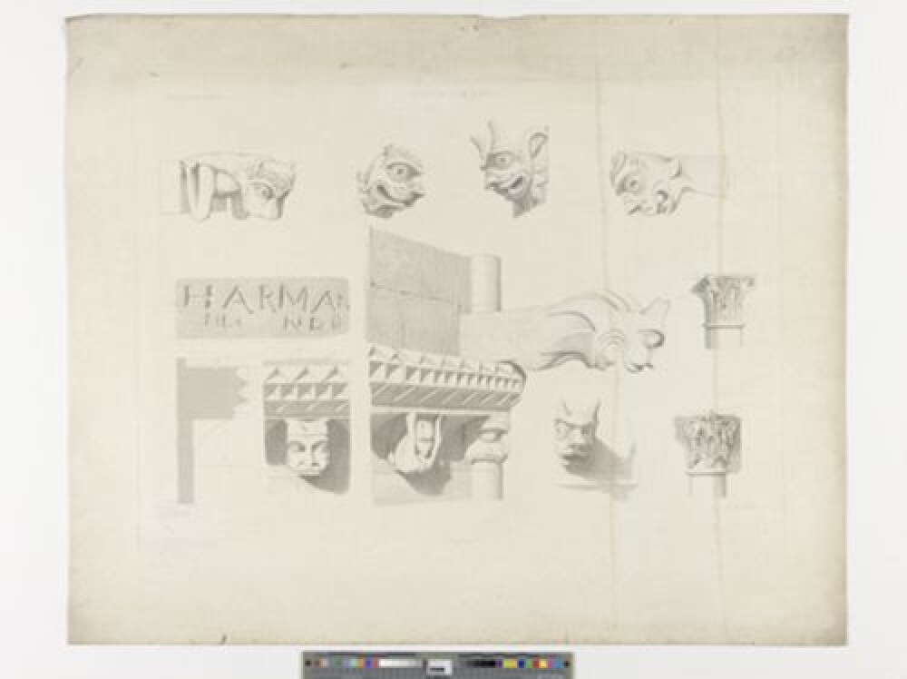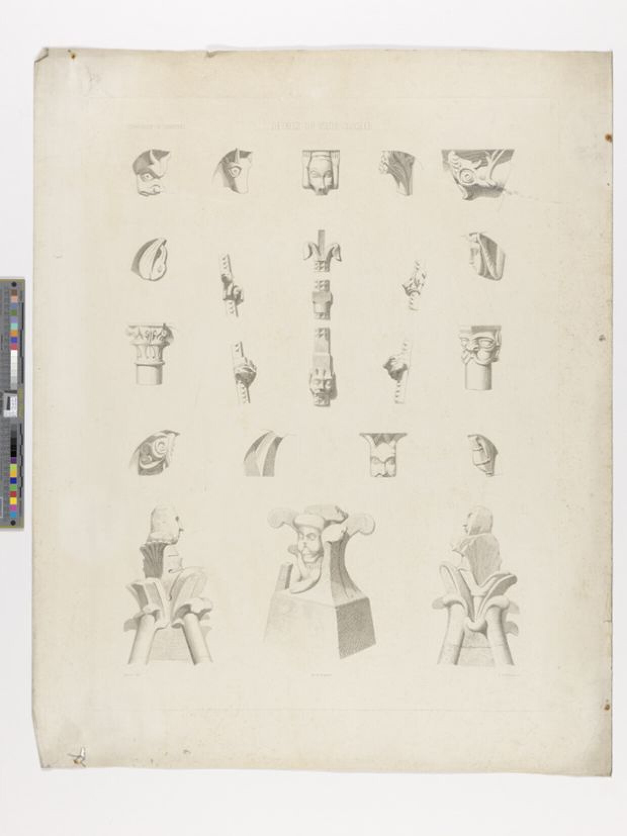 19de eeuwVerschillende architecturale fragmenten van de oude klokkentoren van de kathedraal van Chartres, willekeurig gerangschikt op het blad. Deze prent werd gegraveerd door Auguste-Alexandre Guillaumot naar een tekening van Jean-Baptiste-Antoine Lassus. Ze verscheen als plaat 51 in een reeks prenten uitgegeven door Bougeard.