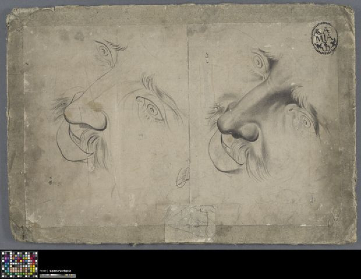 19de eeuwAcademische prent van een studie van het gezicht van een man met een snor. Het gaat om een krijtlithografie die verlijmd is op een steunkarton van liggend formaat, vermoedelijk naar ontwerp van Bernard-Romain Julien. Het gezicht is tweemaal gedrukt: links als een lijntekening en rechts met toevoeging van schaduwaccenten. Daarbij ligt de nadruk op de uitwerking van de neus. De verticale snede in het midden doet vermoeden dat het oorspronkelijk twee losse prenten zijn die samengevoegd en verlijmd werden op eenzelfde steunkarton. De litho links komt uit de plaat 9 en op de rechtse prent staat vermeld dat het om de eerste 'livraison' gaat. De functie van deze prent is gekaderd binnen een educatieve context: de prent is vermoedelijk afkomstig uit een handboek over tekenkunst, zoals 'Cours de dessin' door Julien. Sommige prenten daaruit dienden als lesmateriaal in de klassen van de Academie Brugge. De prenten bootsen krijttekeningen na die als tekenvoorbeeld dienden om verschillende tekenstadia aan te leren.