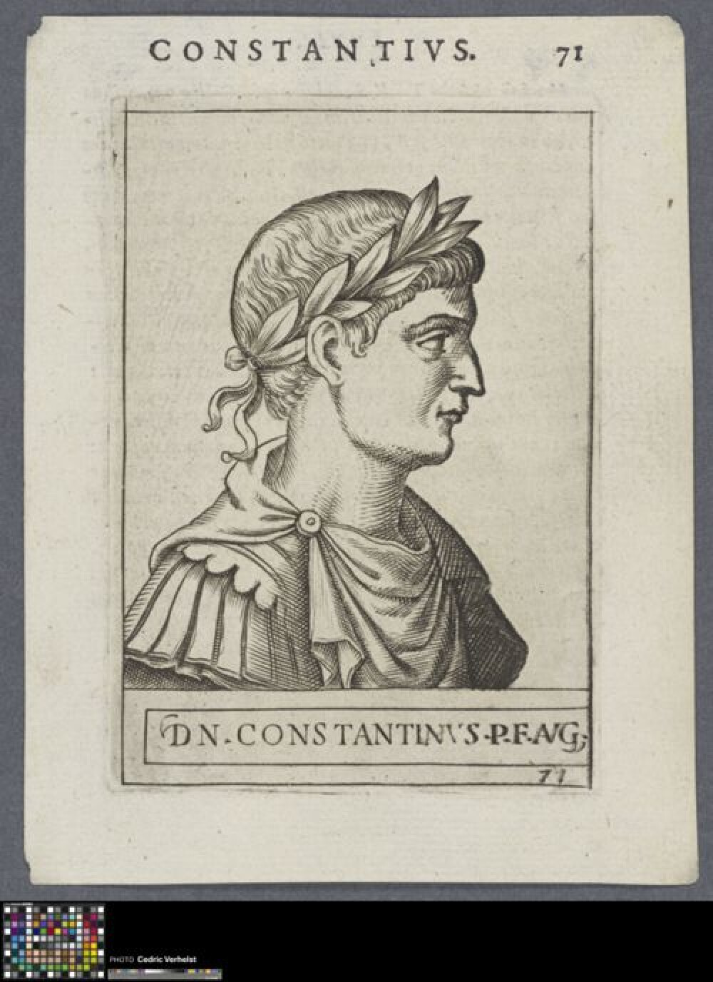16de eeuwPortret van Flavius Magnus Magnentius (ca. 303 - 353), Romeinse keizer vanaf 350. Hij was een usurpator en voerde veel militaire campagnes tegenover zijn medekeizer Constantius. Magnentius kijkt op dit busteportret in profiel naar links. Hij draagt een juwelenband op zijn hoofd en gaat gekleed in een kuras. De gravure is een boekillustratie uit de publicatie "Romanorum Imperatorum effigies" (1583/1592) met 157 portretten van keizers gegraveerd door Giovanni Battista de' Cavalieri en bijhorende lofteksten geschreven door Thomasz Treter. De tekst op de verso zijde verwijst naar het volgende portret. De prent maakt deel uit van een album met (losse) portretten uit de 16de en 17de eeuw (2014.GRO0019.III).